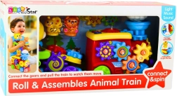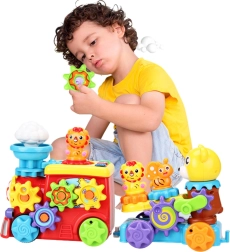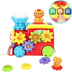 El alegre tren con remolque y osito está diseñado no solo para divertir, sino también para desarrollar la motricidad fina, la atención y la imaginación del niño desde los primeros momentos de juego. El juguete está equipado con engranajes giratorios que involucran las manitas del niño y ayudan a desarrollar movimientos precisos. Los efectos de luz y sonido estimulan los sentidos e introducen al niño en el mundo de los estímulos audiovisuales. En el centro del tren se encuentra una nubecita en movimiento y delante del remolque una abejita, que se activa girando una manivela especial junto al osito.