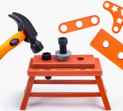 Todos los componentes están fabricados en plástico duradero y seguro, sin bordes afilados. El práctico maletín sirve no solo como espacio de almacenamiento, sino también como una forma sencilla de transportar el taller, por ejemplo, al jardín o a casa de los abuelos.
