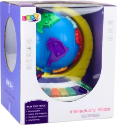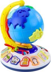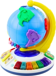 El globo interactivo tiene en su superficie 7 bloques de colores que representan los continentes con imágenes de animales amistosos. Al colocar cada bloque en el lugar correcto, el niño escuchará el nombre del continente, del animal y un sonido realista, lo cual es una excelente manera de aprender geografía.