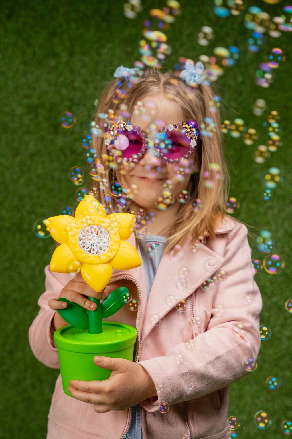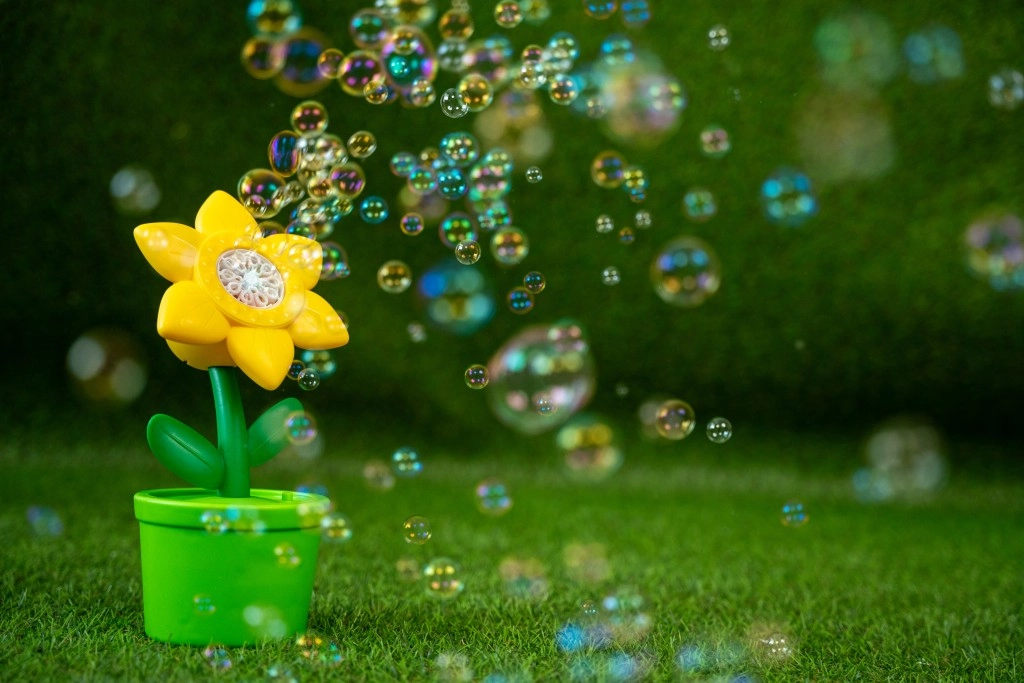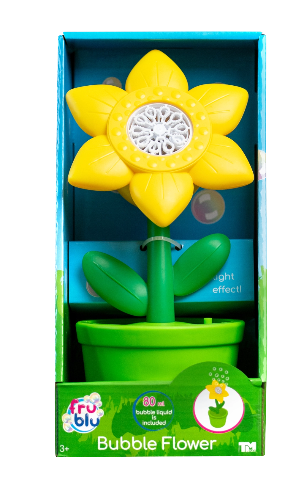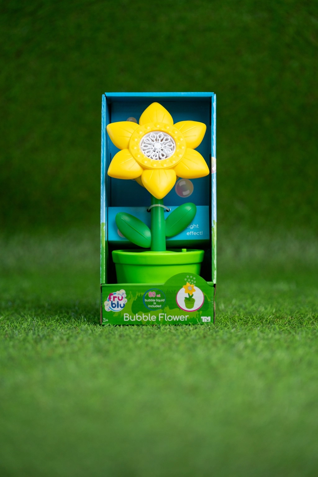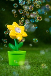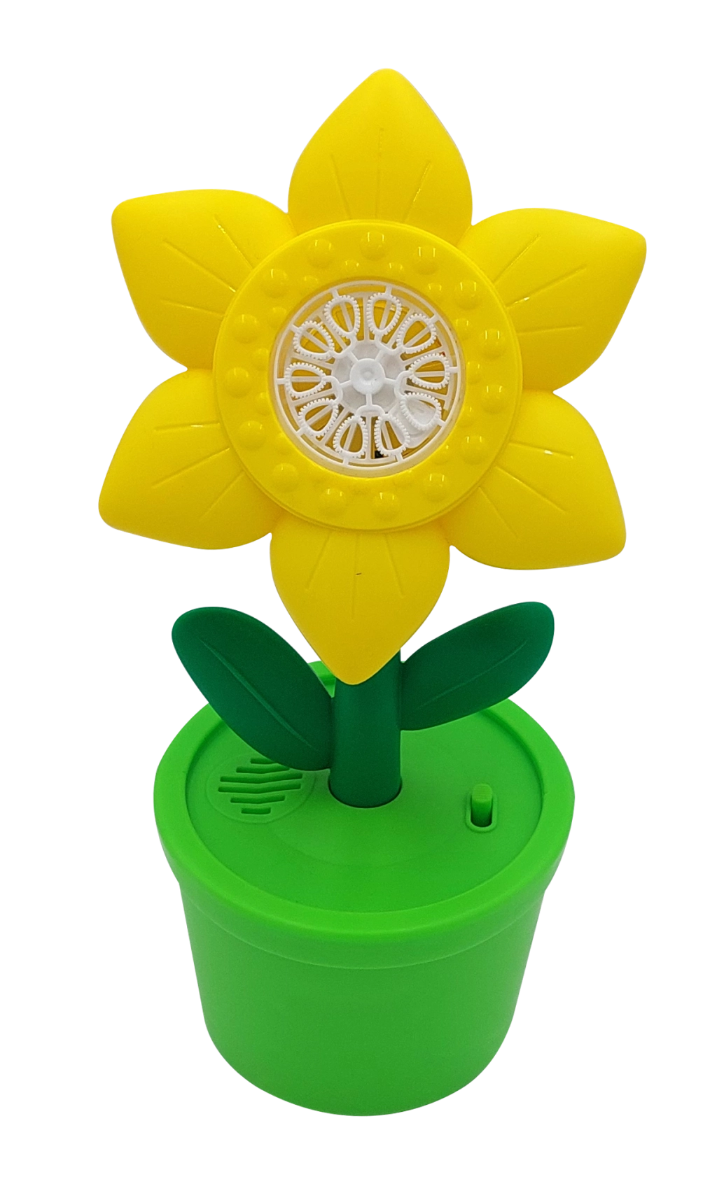 El diseño en forma de flor amarilla en una maceta verde cautiva a primera vista y convierte cualquier juego en un divertido espectáculo lleno de burbujas.