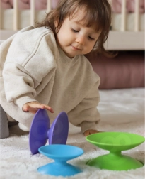 Apilar y deslizar los discos por la espiral fomenta el agarre, la precisión de movimientos y la coordinación mano-ojo en niños desde los 10 meses.