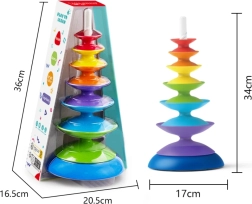 La torre está hecha de plástico de alta calidad sin BPA y, gracias a su base ancha, es estable durante el juego. La altura total es de aproximadamente 34 cm, por lo que es fácil de agarrar incluso para manos pequeñas. Una gran opción para jugar a diario en casa y como regalo original.