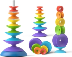 Los niños pueden apilar por tamaño, por colores o dejar que las piezas se deslicen por la espiral: la variedad mantiene la atención y estimula la creatividad.
