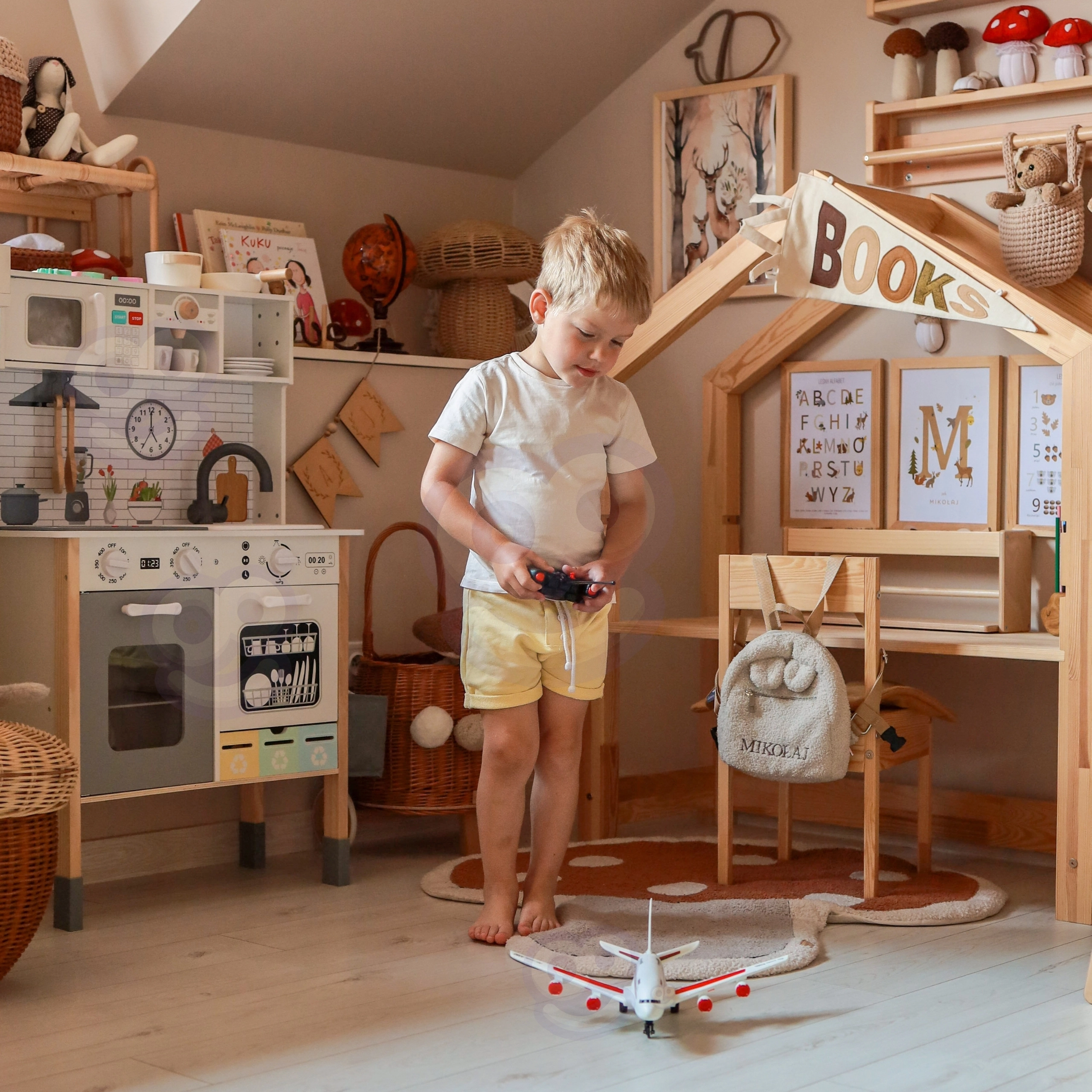 El modelo está pensado para desplazarse por el suelo o la acera: los niños pueden practicar rodaje, giro y frenado, crear su propio “aeropuerto” y escenarios de transporte aéreo. El control remoto es fácil de usar y favorece el desarrollo de la motricidad y la imaginación.