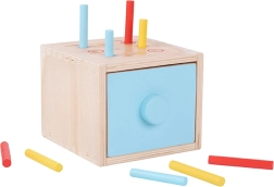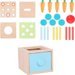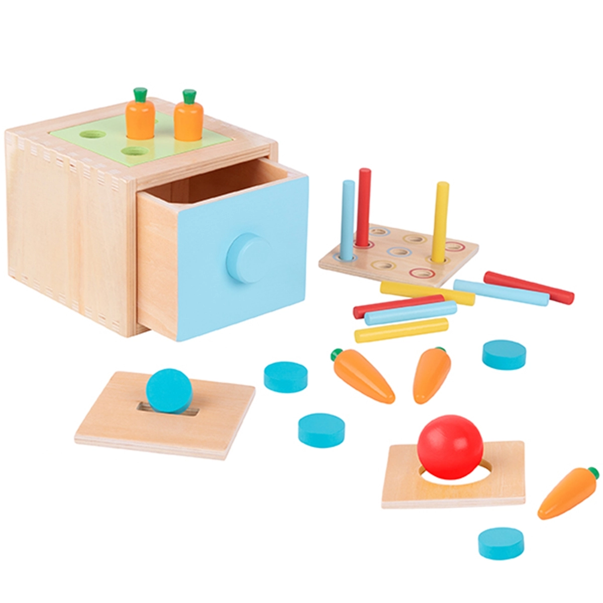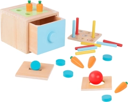- - Contiene 26 piezas: cajón, 4 insertos de clasificación, 1 pelota roja, 5 monedas, 5 zanahorias, 9 palitos en tres colores