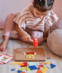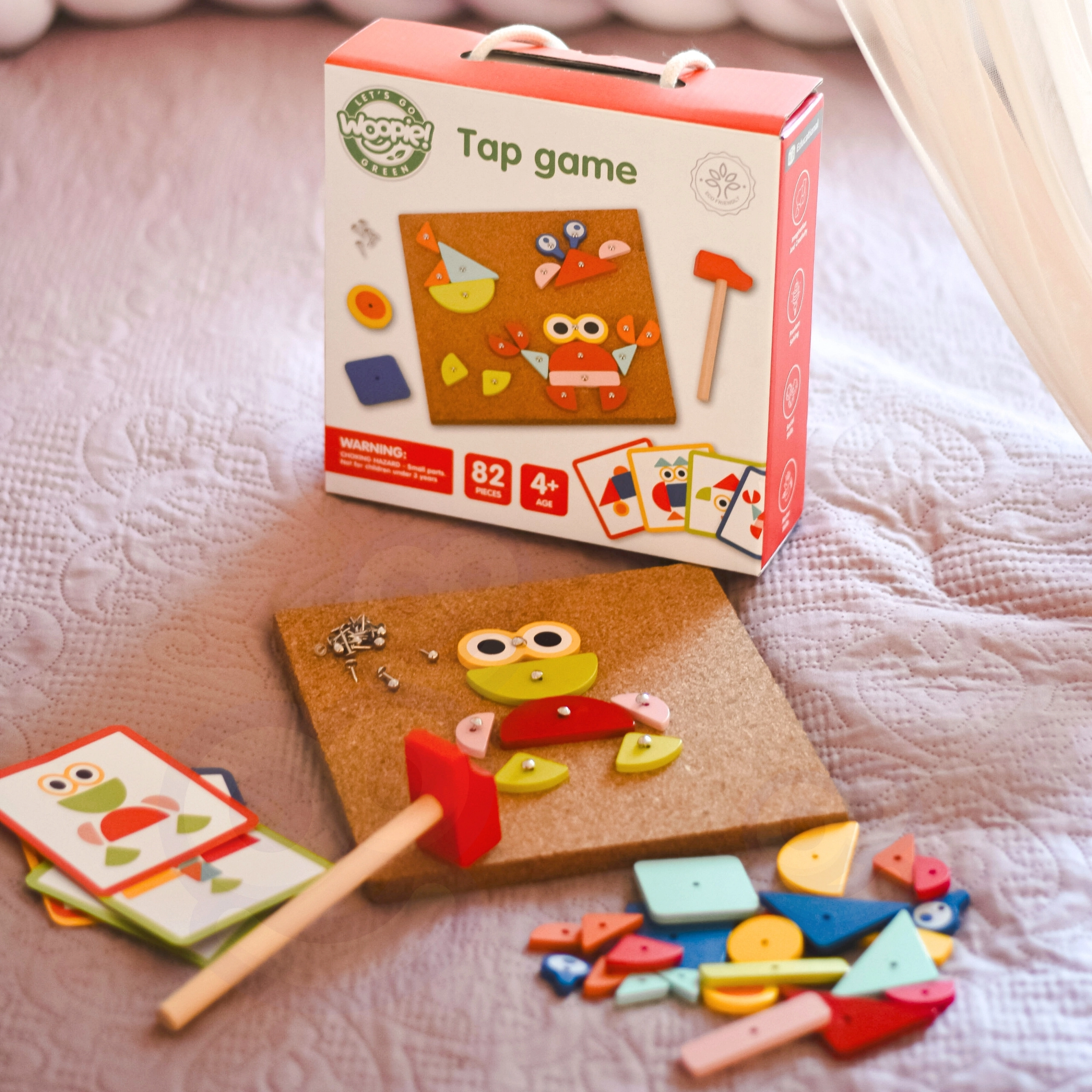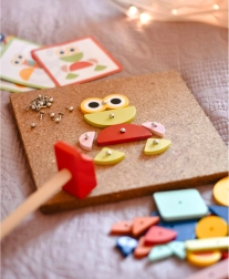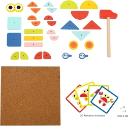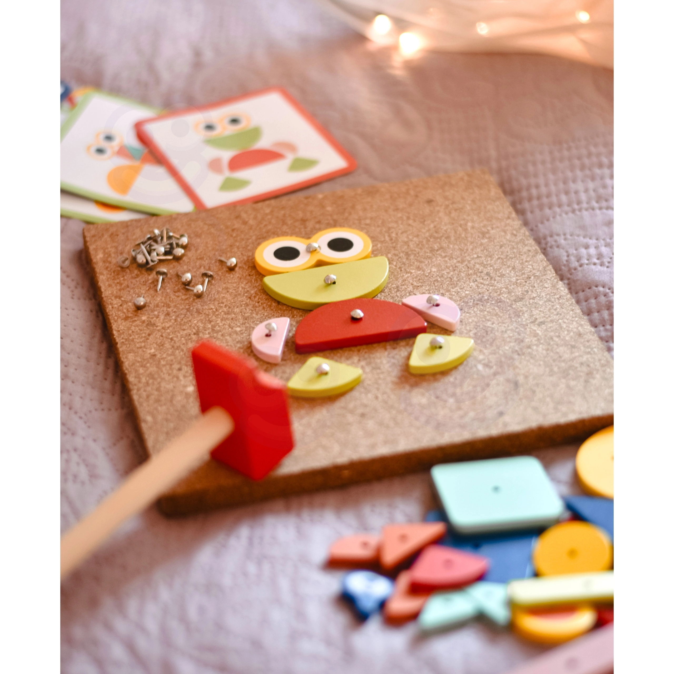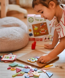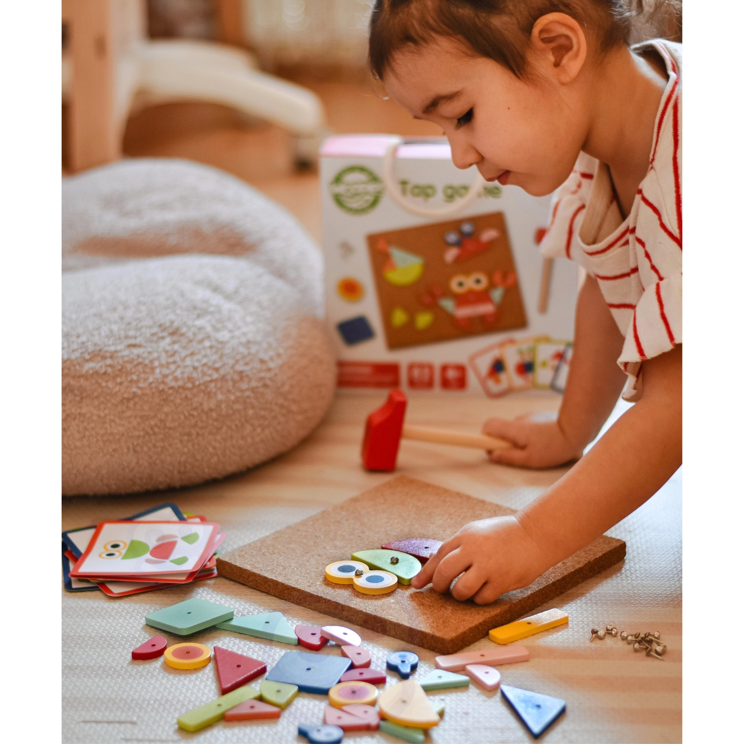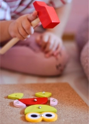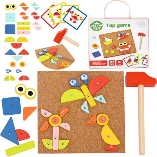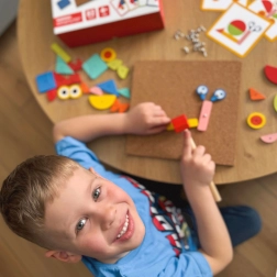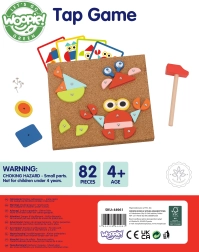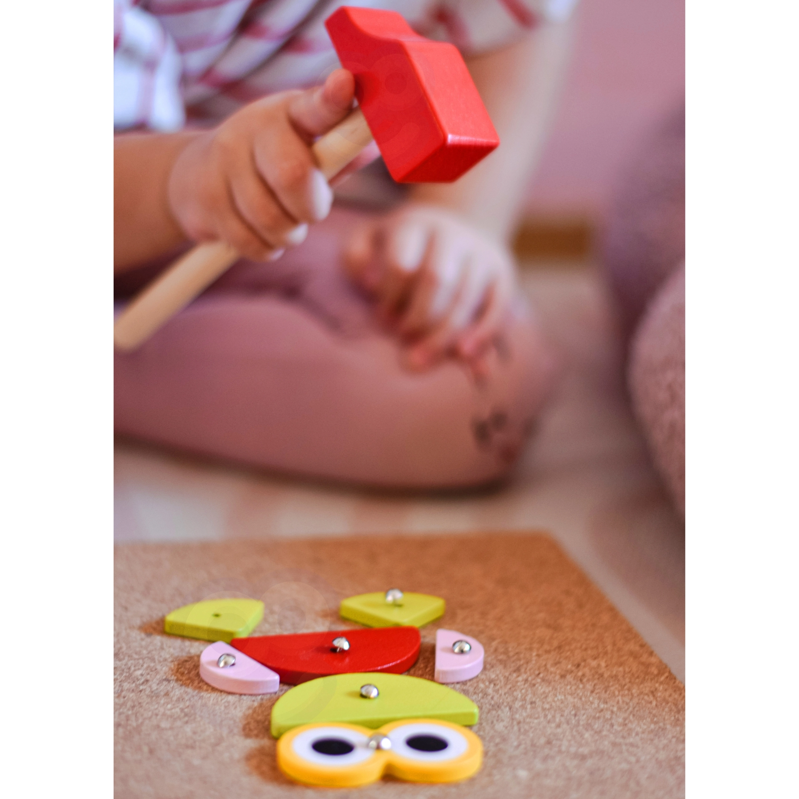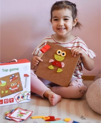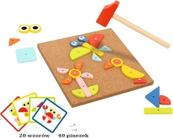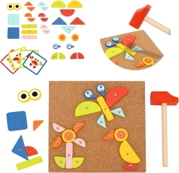 El juguete de golpeo WOOPIE Green es una excelente manera de fomentar la creatividad y el pensamiento lógico de los niños. El set consta de 30 bloques de madera, 10 tarjetas de doble cara con 20 patrones en tres niveles de dificultad, 40 chinchetas, una tablilla y un martillito. Los niños intentan reproducir fielmente la imagen de la tarjeta usando bloques de diferentes formas y colores, o pueden crear sus propios diseños según su imaginación y creatividad.