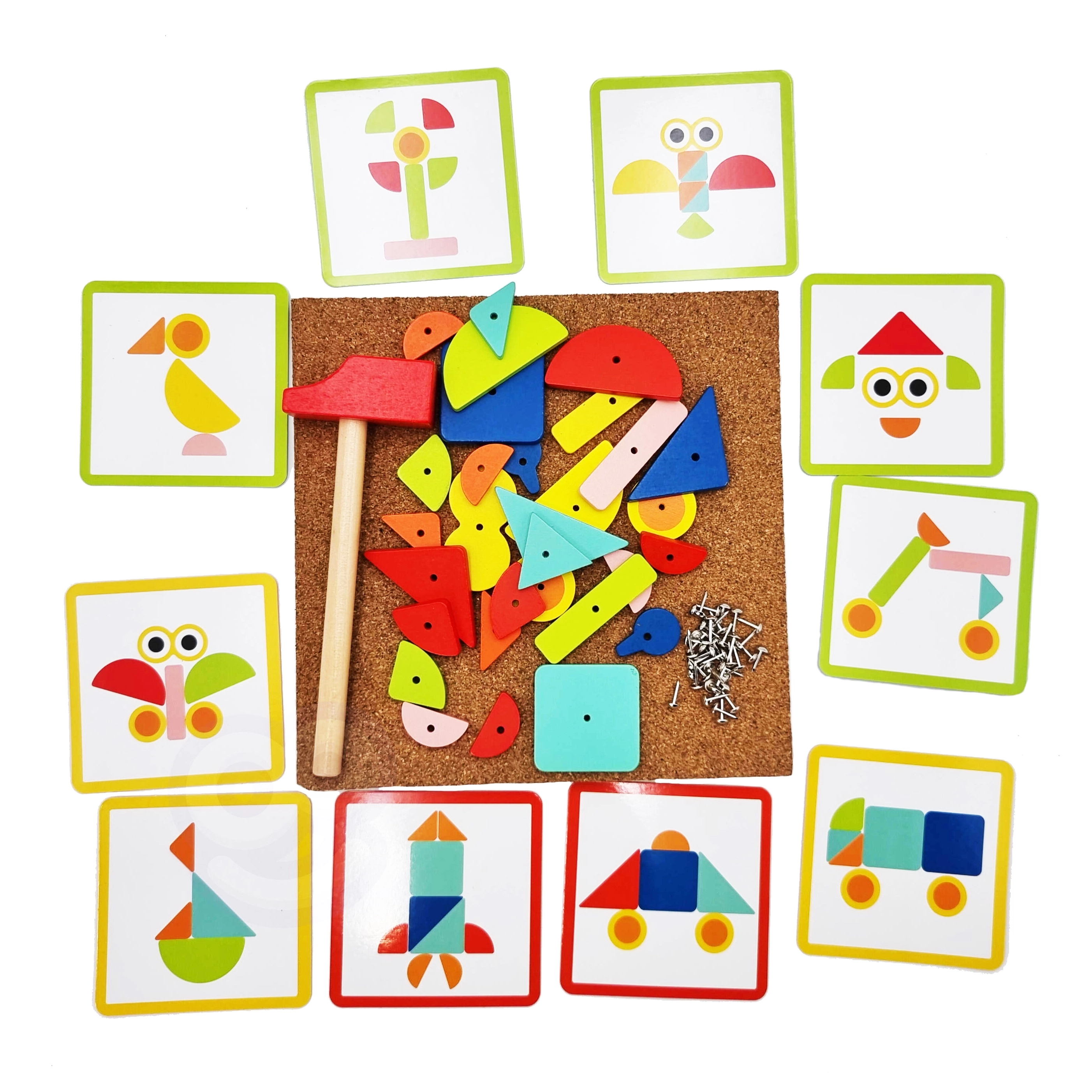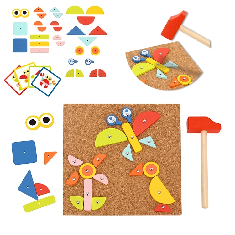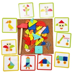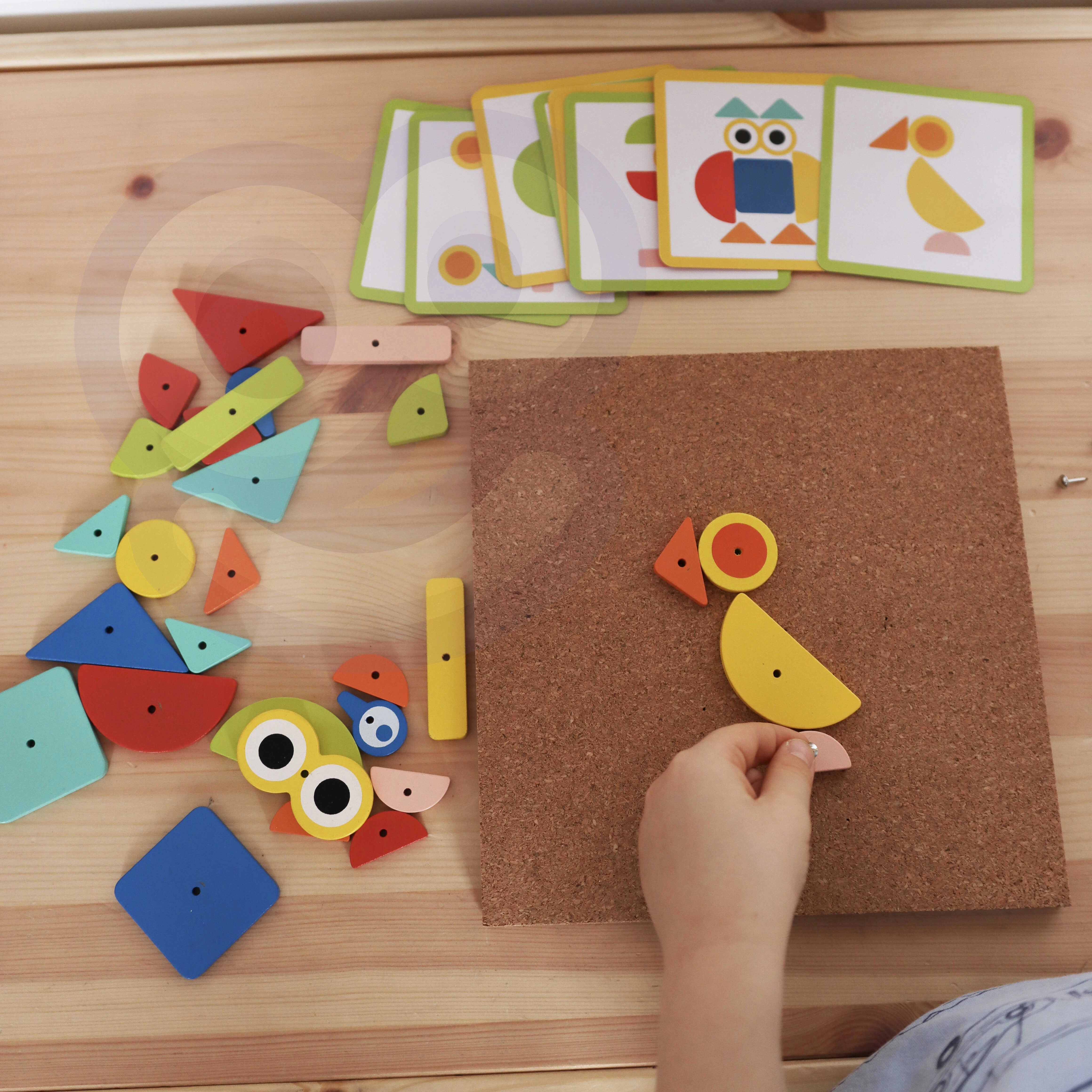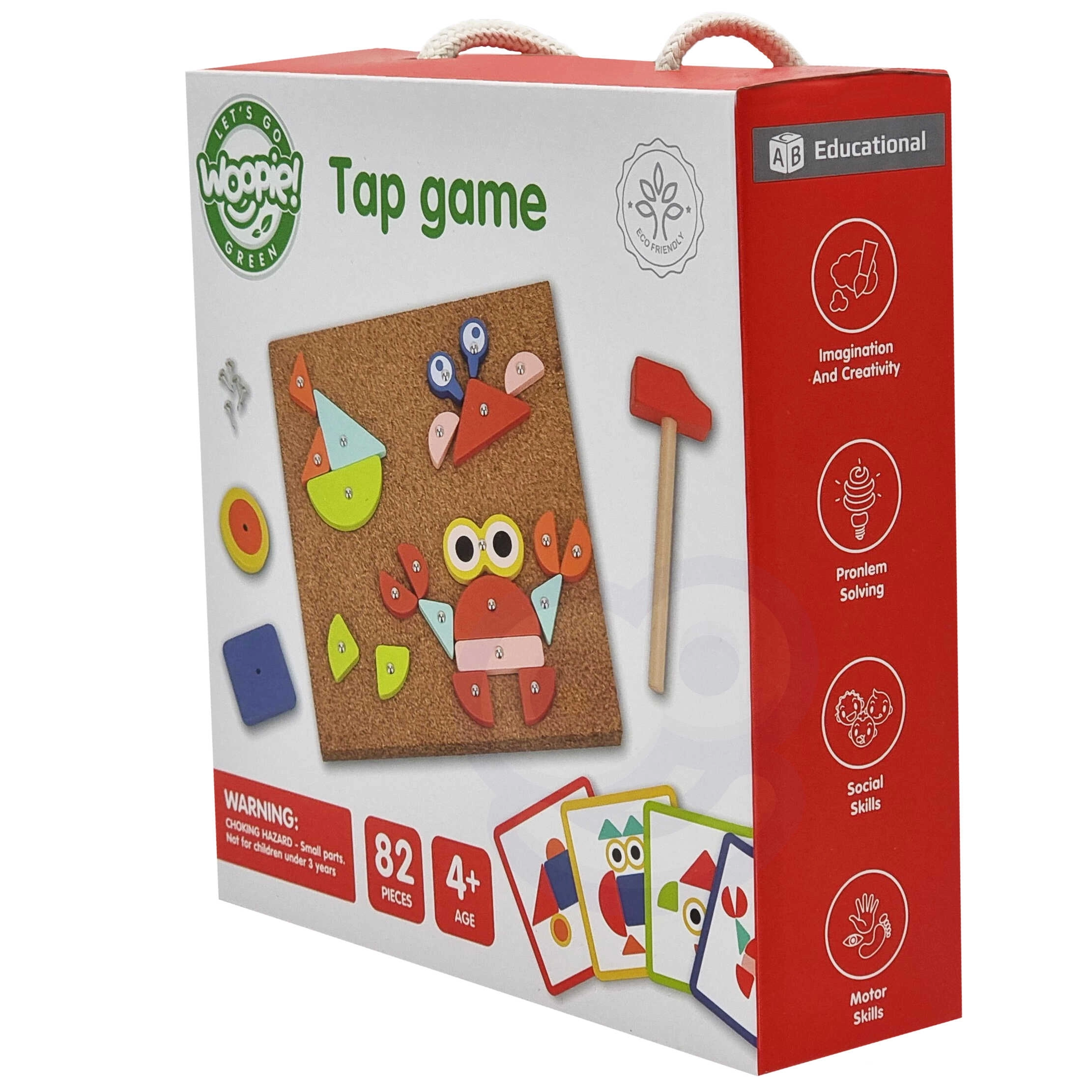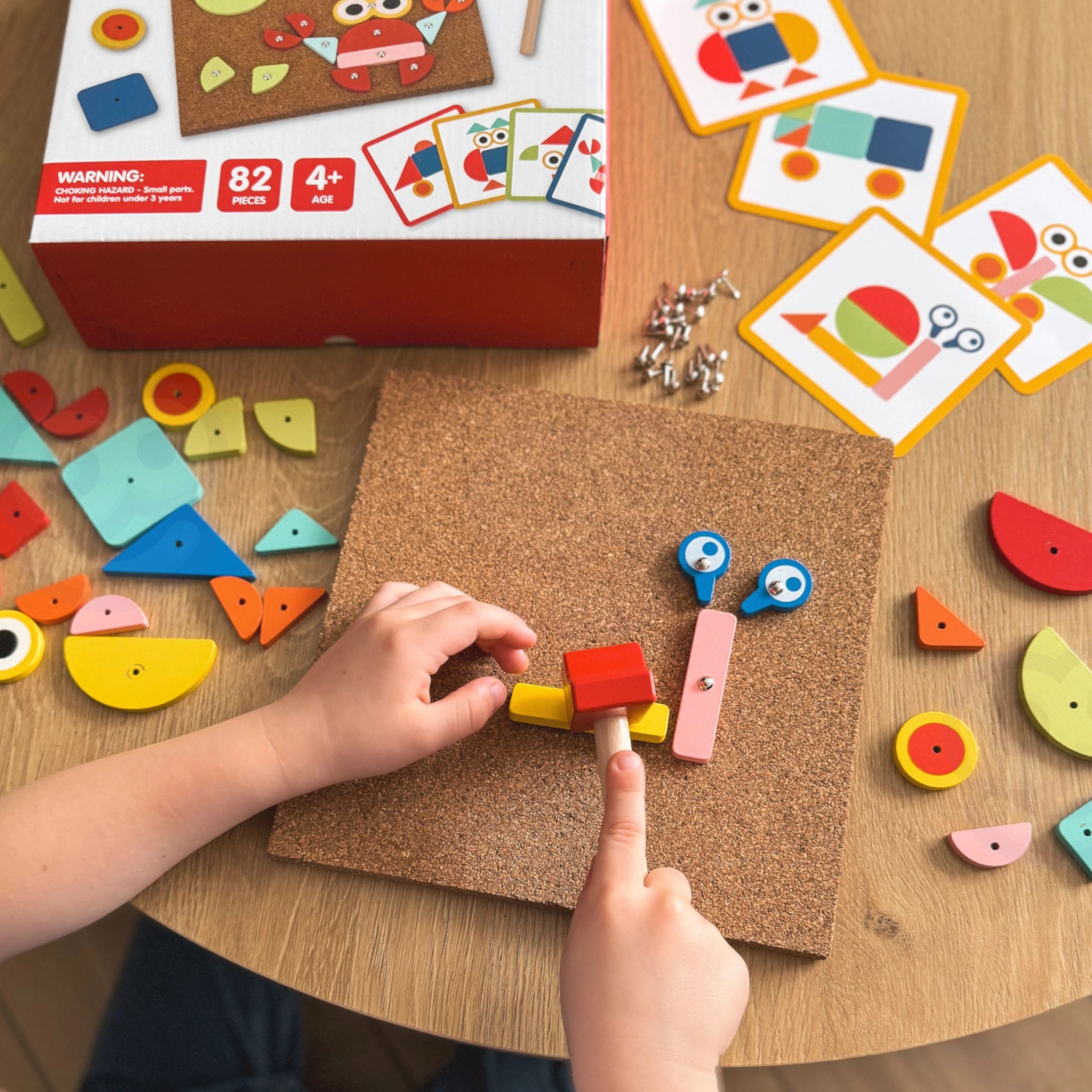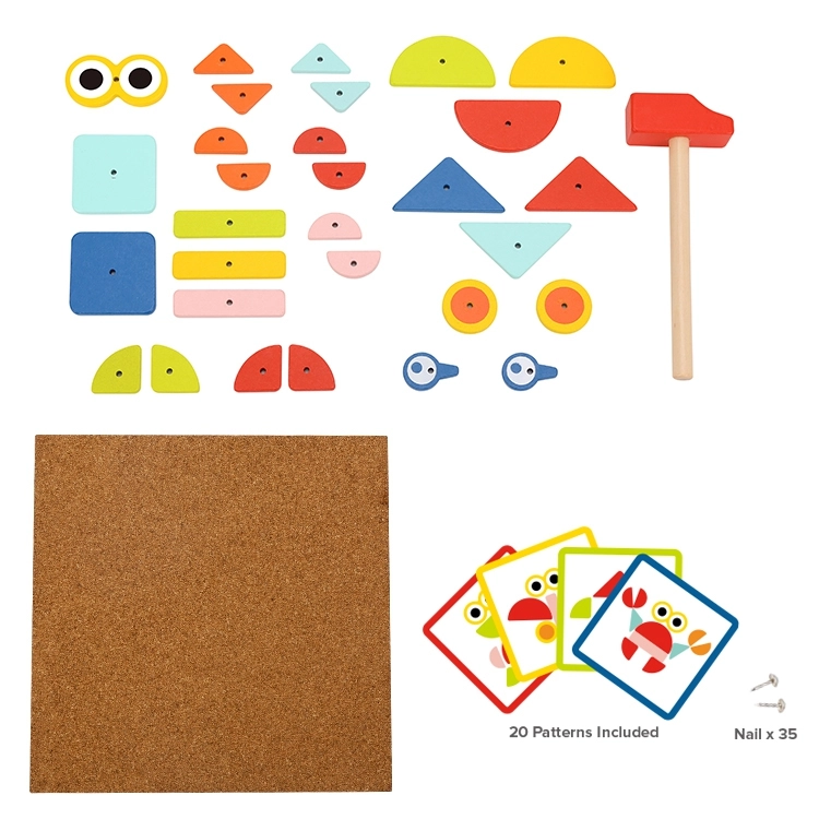 El juguete de golpeo WOOPIE Green es una excelente manera de fomentar la creatividad y el pensamiento lógico de los niños. El set consta de 30 bloques de madera, 10 tarjetas de doble cara con 20 patrones en tres niveles de dificultad, 40 chinchetas, una tablilla y un martillito. Los niños intentan reproducir fielmente la imagen de la tarjeta usando bloques de diferentes formas y colores, o pueden crear sus propios diseños según su imaginación y creatividad.