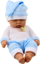 La muñeca tiene un tamaño compacto de aproximadamente 24 x 12 cm, ideal para las manos de los niños. El pijama es de material suave en un bonito color azul, complementado con un tierno gorro con pompón. Un pequeño estampado en la camiseta con motivo de chupete aporta a la muñeca un delicado encanto infantil.