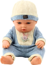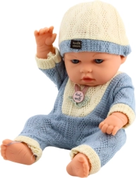 La muñeca mide aproximadamente 29 x 15 cm, lo que la hace lo suficientemente grande como para causar impresión, pero a la vez ligera y fácil de manejar: se sostiene idealmente en manos pequeñas y cabe sin problemas en la mayoría de cochecitos o cunas de juguete. Viste un suave conjunto de punto en tonos crema claro y azul pastel, decorado con un parche.