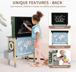 - Centro de juego 9en1: cocinar, hornear, lavar platos, lavar ropa, dibujar, aprender y separar residuos.