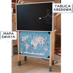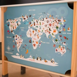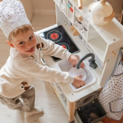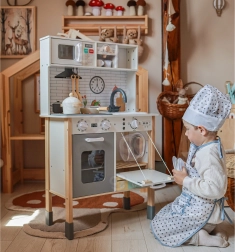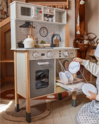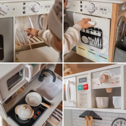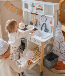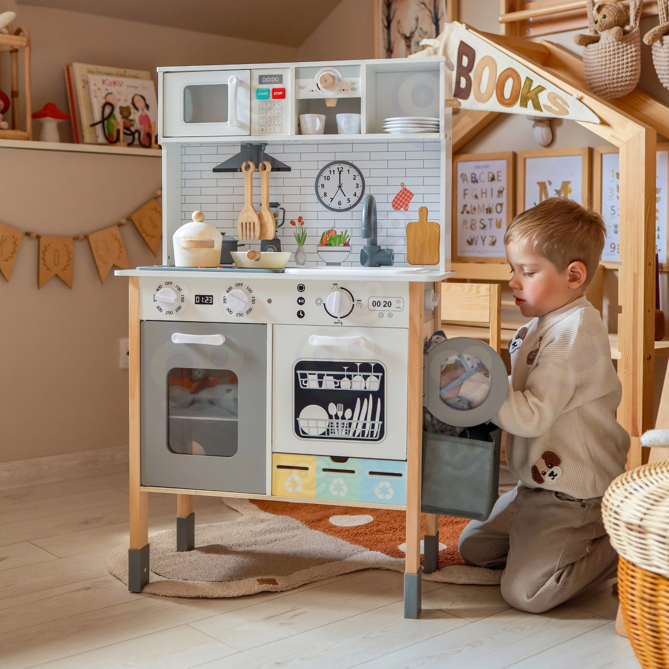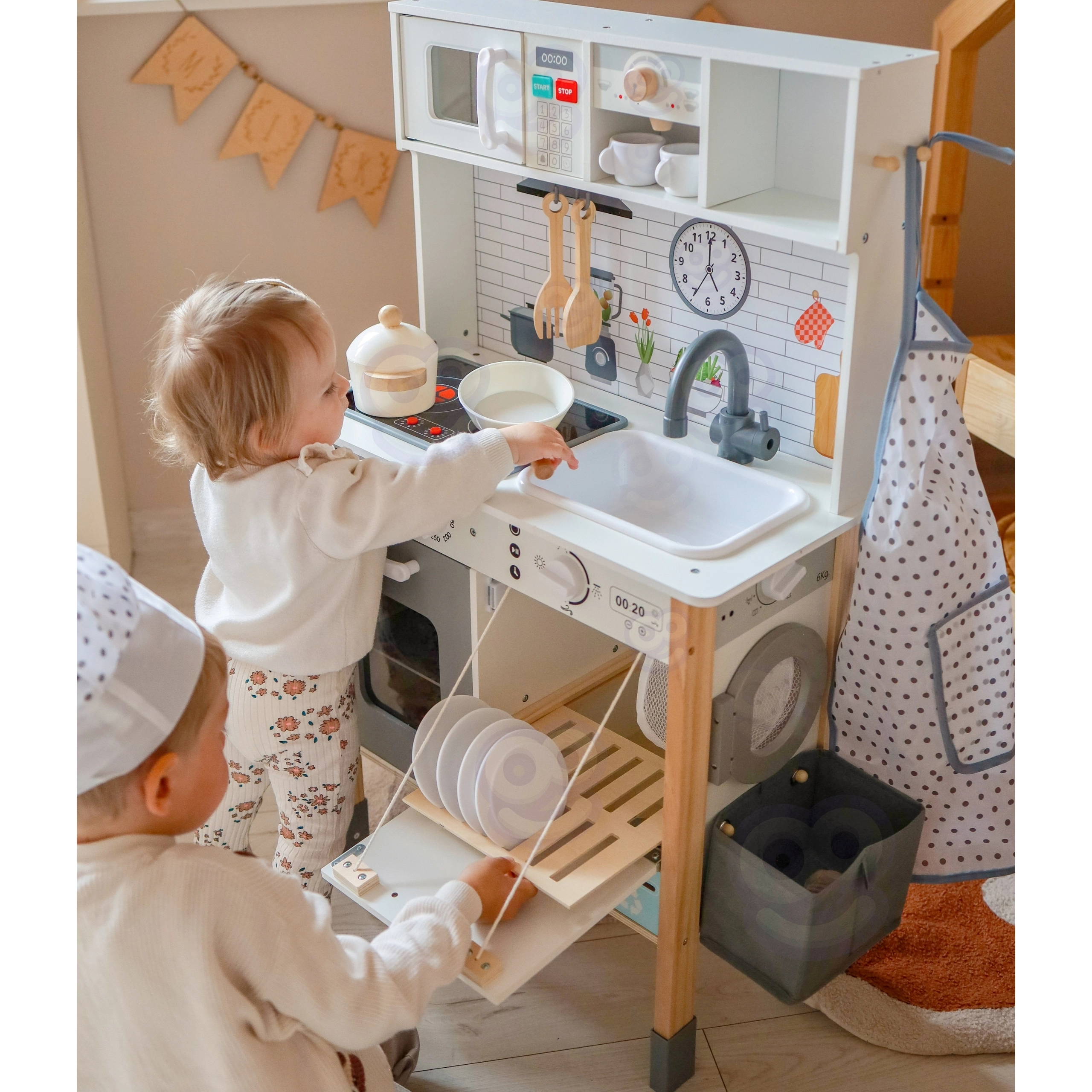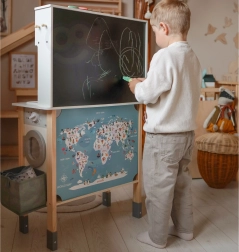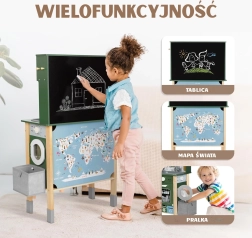 Esta cocina de madera WOOPIE GREEN está diseñada para pequeños chefs y exploradores. La parte frontal ofrece una completa zona culinaria con cafetera, microondas, fregadero, horno, lavavajillas y placa de inducción con luces y sonidos. En el lateral dispone de una práctica lavadora con cesta para la ropa, que enseña rutinas infantiles de forma lúdica. La parte trasera oculta una pizarra de tiza y un mapa del mundo a color para dibujar, conocer los continentes y desarrollar la imaginación.