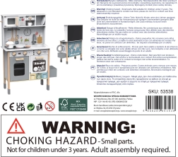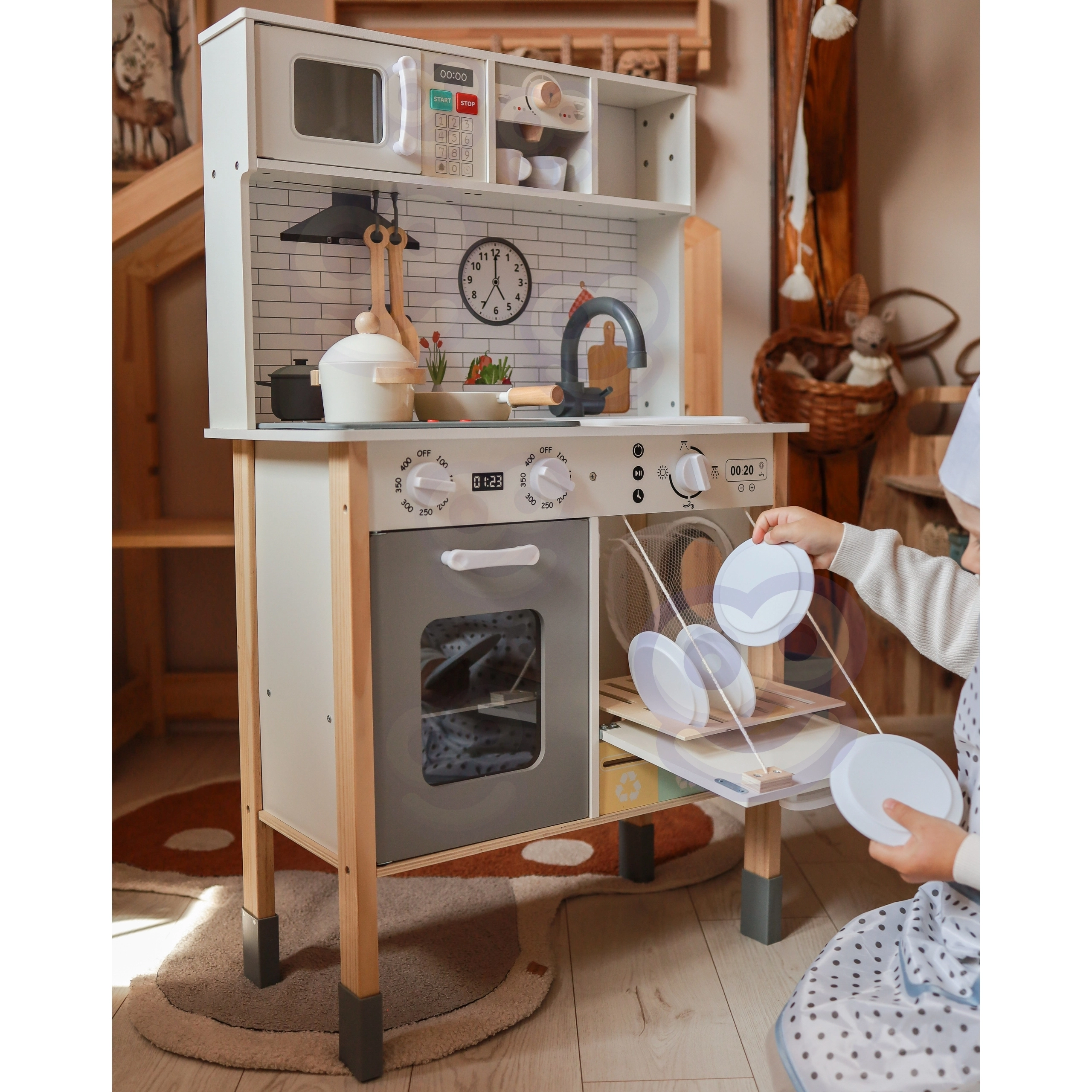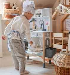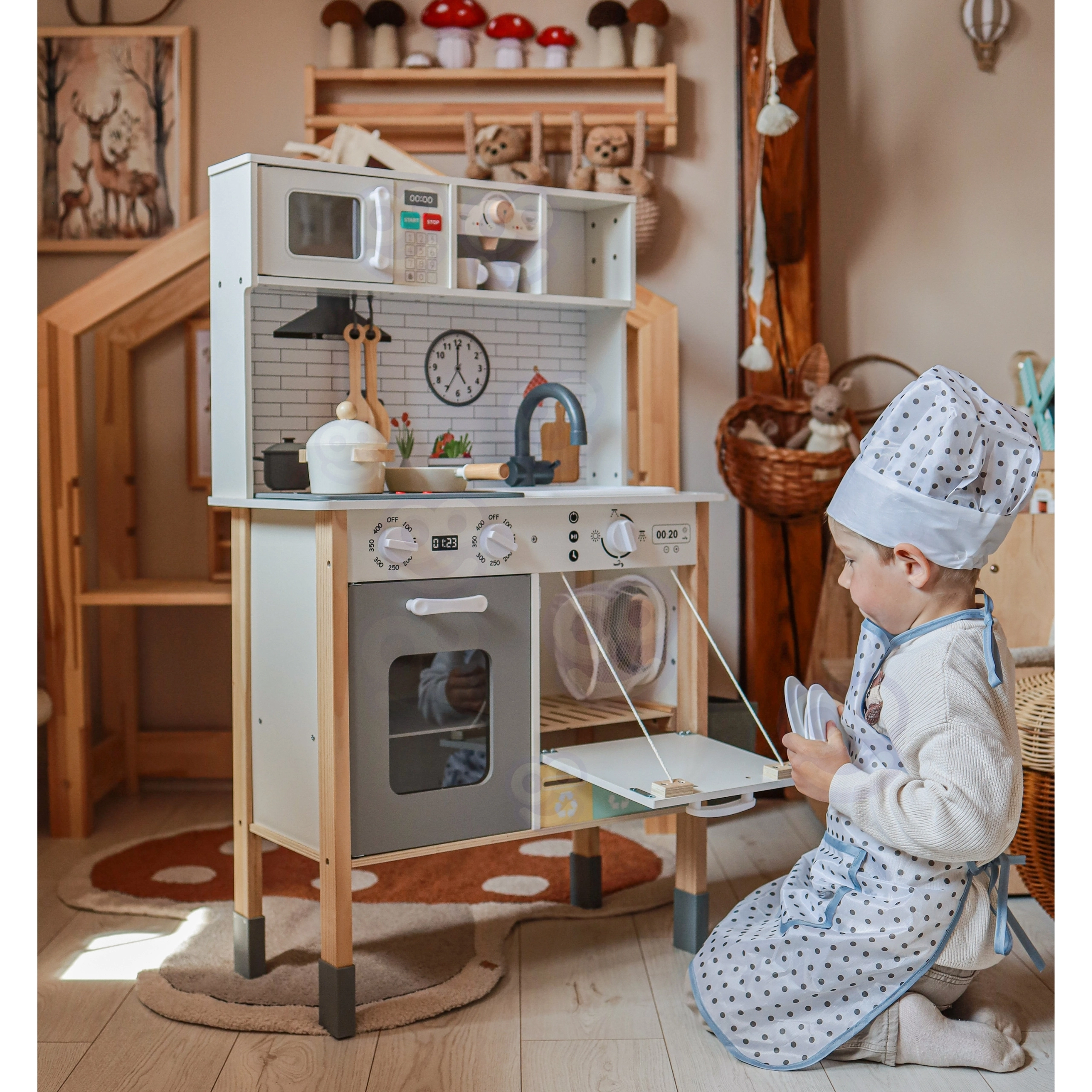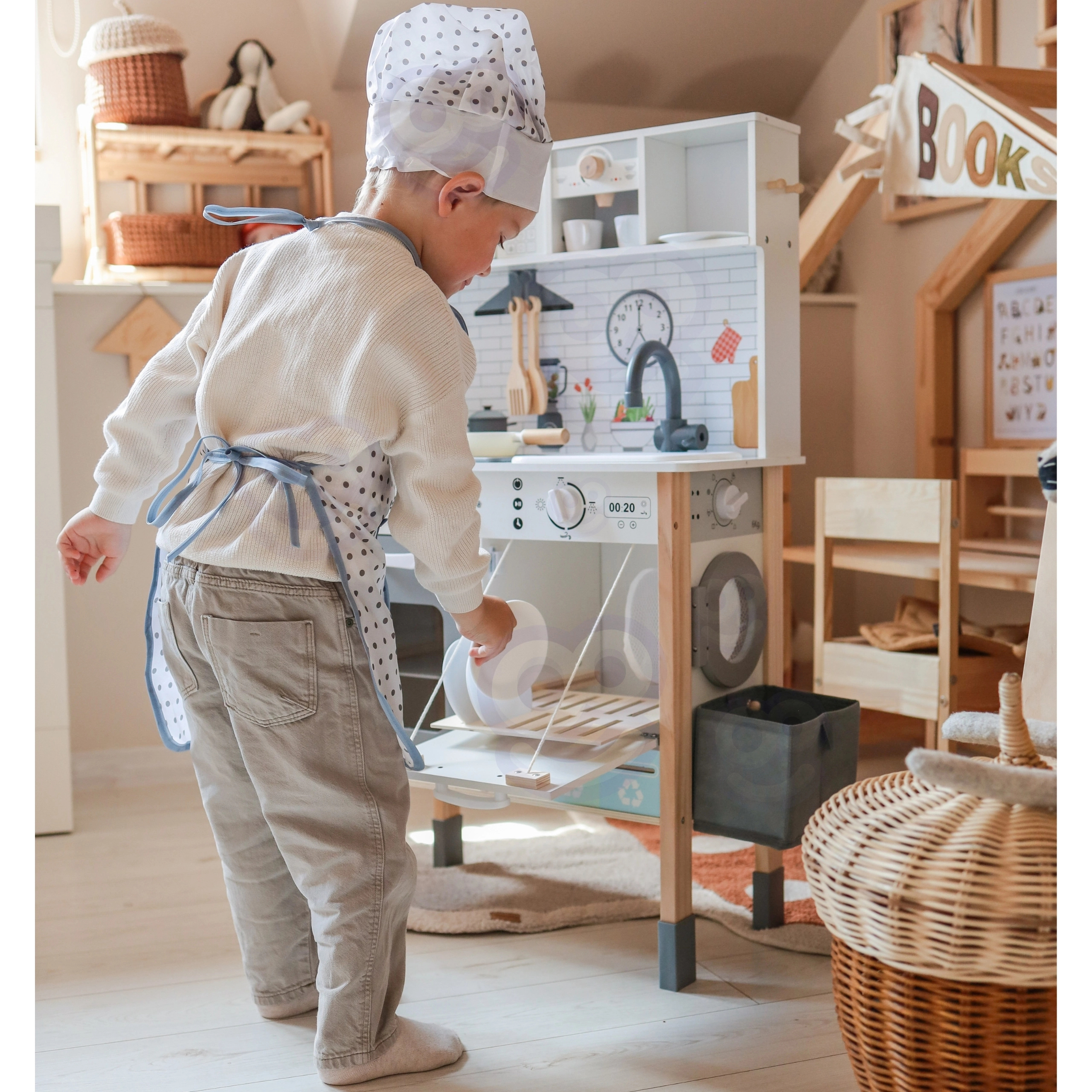 Incluye abundantes accesorios: vajilla, equipamiento de cocina, tabla para la separación de residuos con cubos extraíbles y set de cocinero (delantal y gorro). La altura de la cocina es ajustable para un uso cómodo. Las pilas no están incluidas.