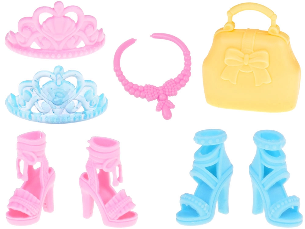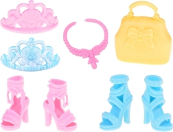 Dos elegantes pares de zapatos de tacón añaden encanto y estilo al conjunto. Los accesorios, como un práctico bolso, un collar rosa y dos coronas, son perfectos para toda pequeña princesa.