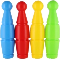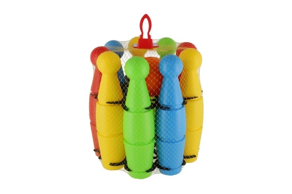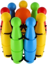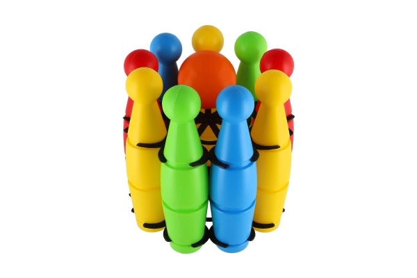 Un divertido set para pequeños jugadores de bolos que incluye 9 bolos de plástico de colores y una bola de plástico. Un juguete ligero y seguro para interior y jardín que ayuda a desarrollar la motricidad fina, la concentración, la precisión y el fair play. Los bolos tienen una altura de 24 cm y todo el set viene envasado en una práctica malla.