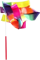 Fabricada en material sintético ligero pero resistente con brillo suave, es anti-enredos y responde de forma excelente al movimiento. La cinta incluye una varilla con empuñadura de colores y una unión flexible con muelle, que evita torsiones y permite maniobras fluidas.