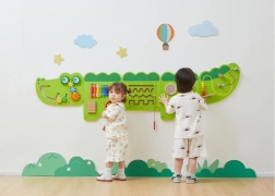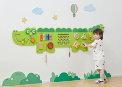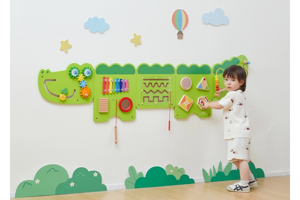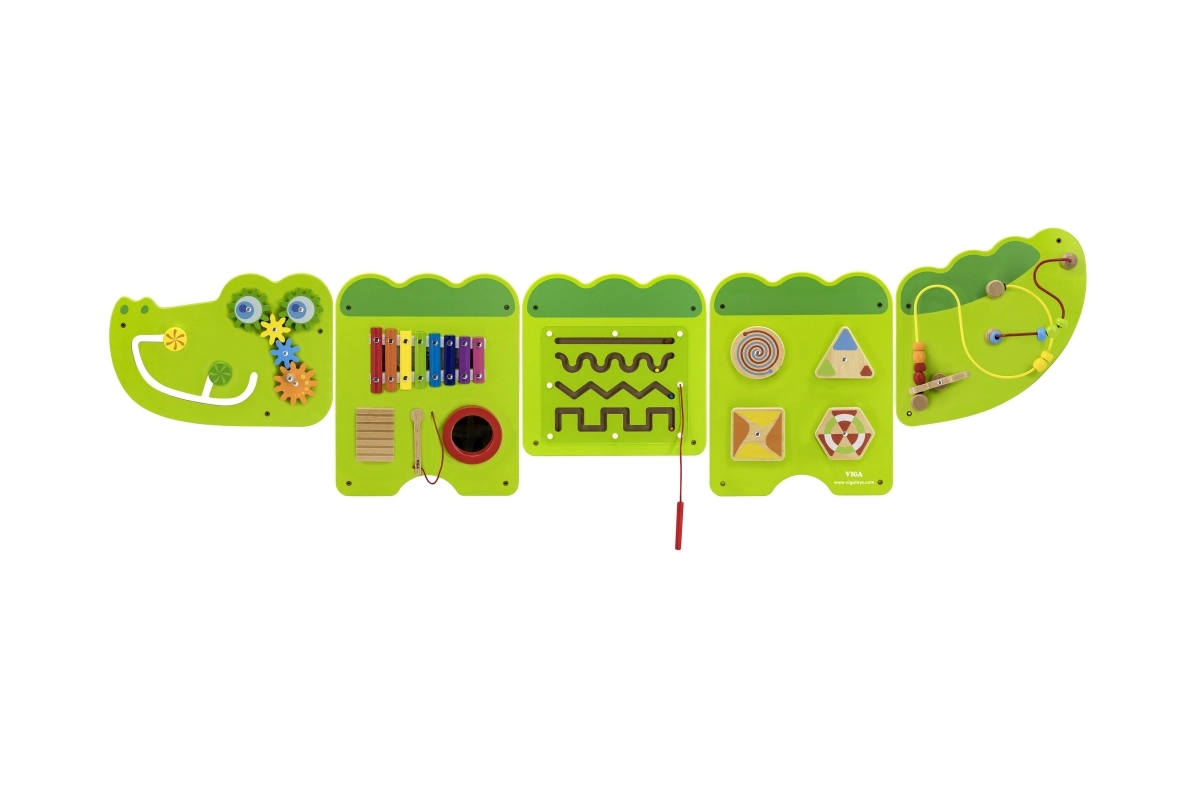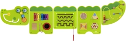 Este gran tablero de actividades mural con forma de alegre cocodrilo está dividido en varios paneles que invitan a los niños a explorar. Sus elementos de colores estimulan la curiosidad, desarrollan los sentidos y favorecen el juego autónomo. La sólida estructura de madera con bordes suaves es segura y resistente para el uso diario.