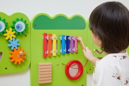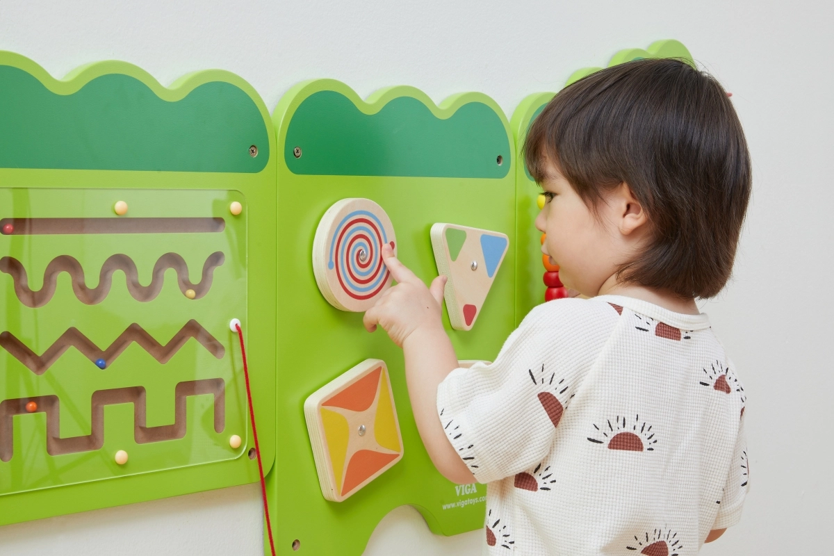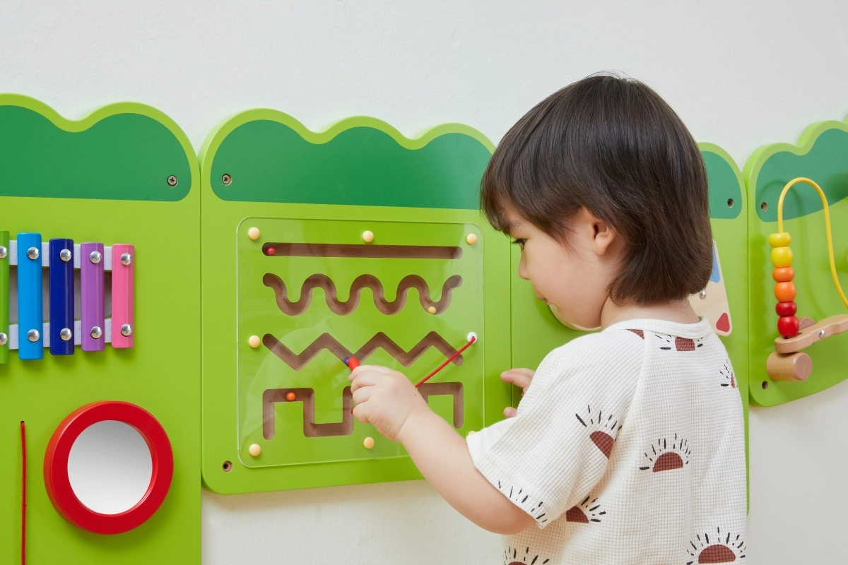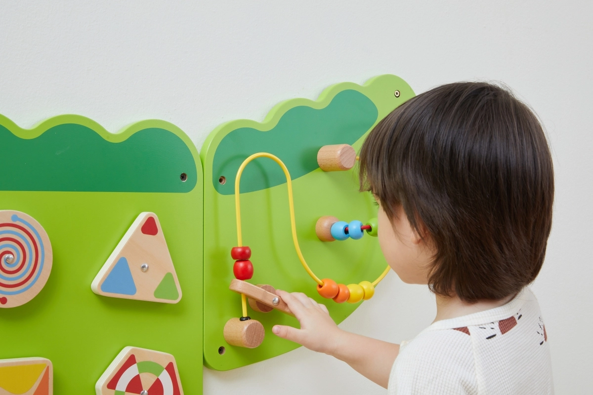 Cada panel ofrece un tipo de actividad diferente: desde tocar el xilófono, girar ruedas dentadas y discos con patrones, hasta guiar cuentas y mover piezas en los laberintos. Los niños ejercitan de forma natural la coordinación, el agarre, la paciencia y la resolución de problemas. El montaje en pared ahorra espacio y permite que jueguen varios niños a la vez.