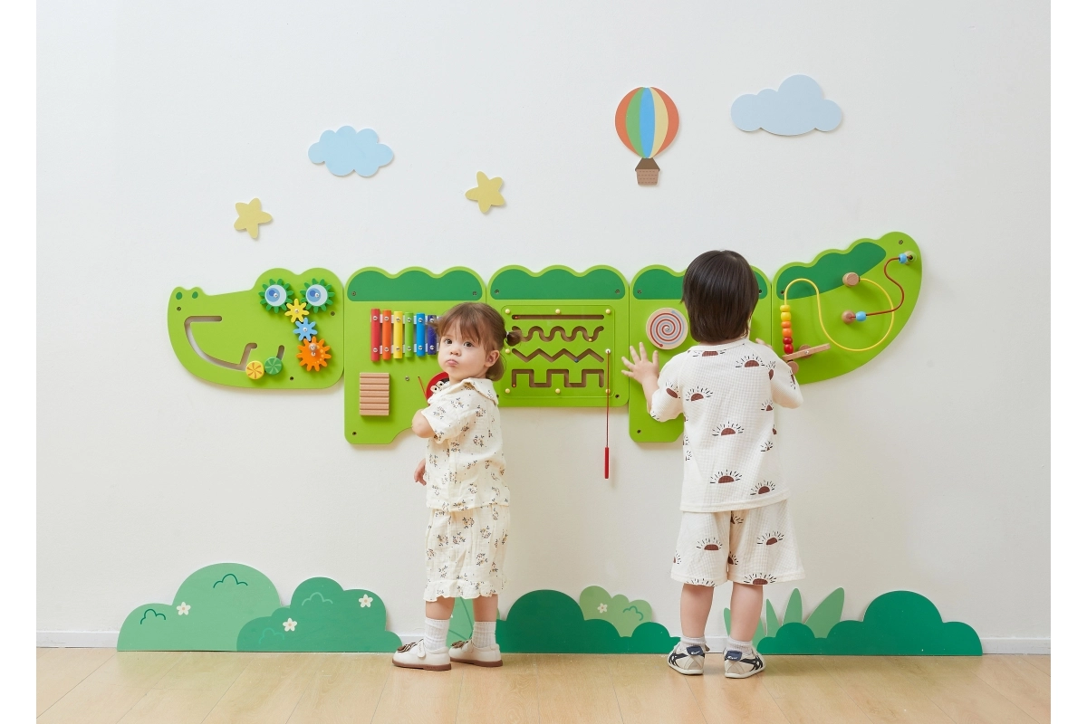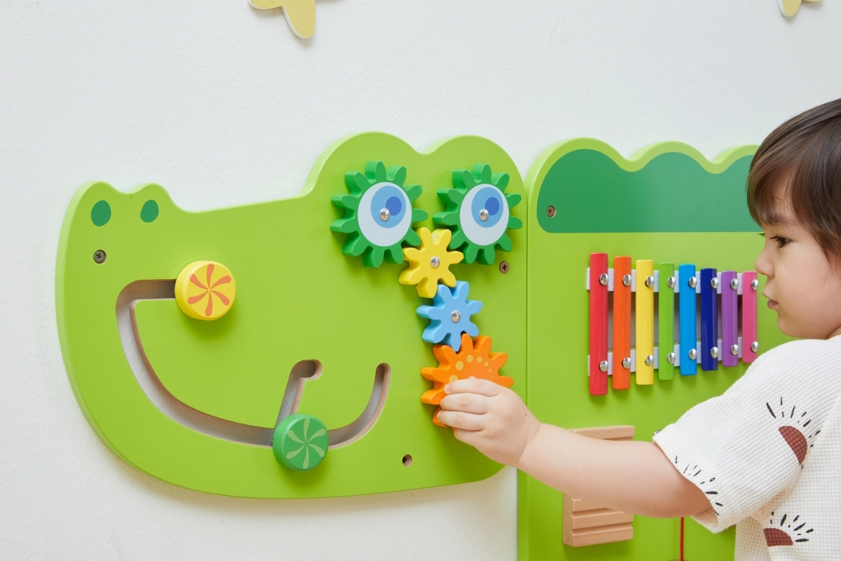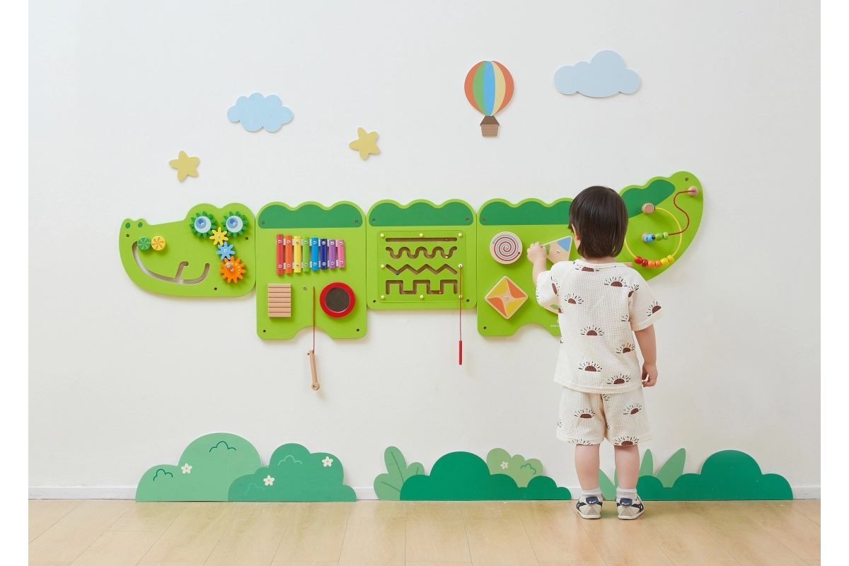 Divertido tablero mural de madera con forma de cocodrilo que ofrece a los niños desde 18 meses horas de exploración sensorial y entrenamiento de la motricidad fina. Incluye xilófono, ruedas dentadas, laberinto, elementos deslizantes y giratorios, y cuentas en alambre que desarrollan la coordinación ojo–mano, el pensamiento lógico y la percepción musical. Al montarse en la pared, ahorra espacio y es ideal para dormitorios infantiles, guarderías y zonas de juego.