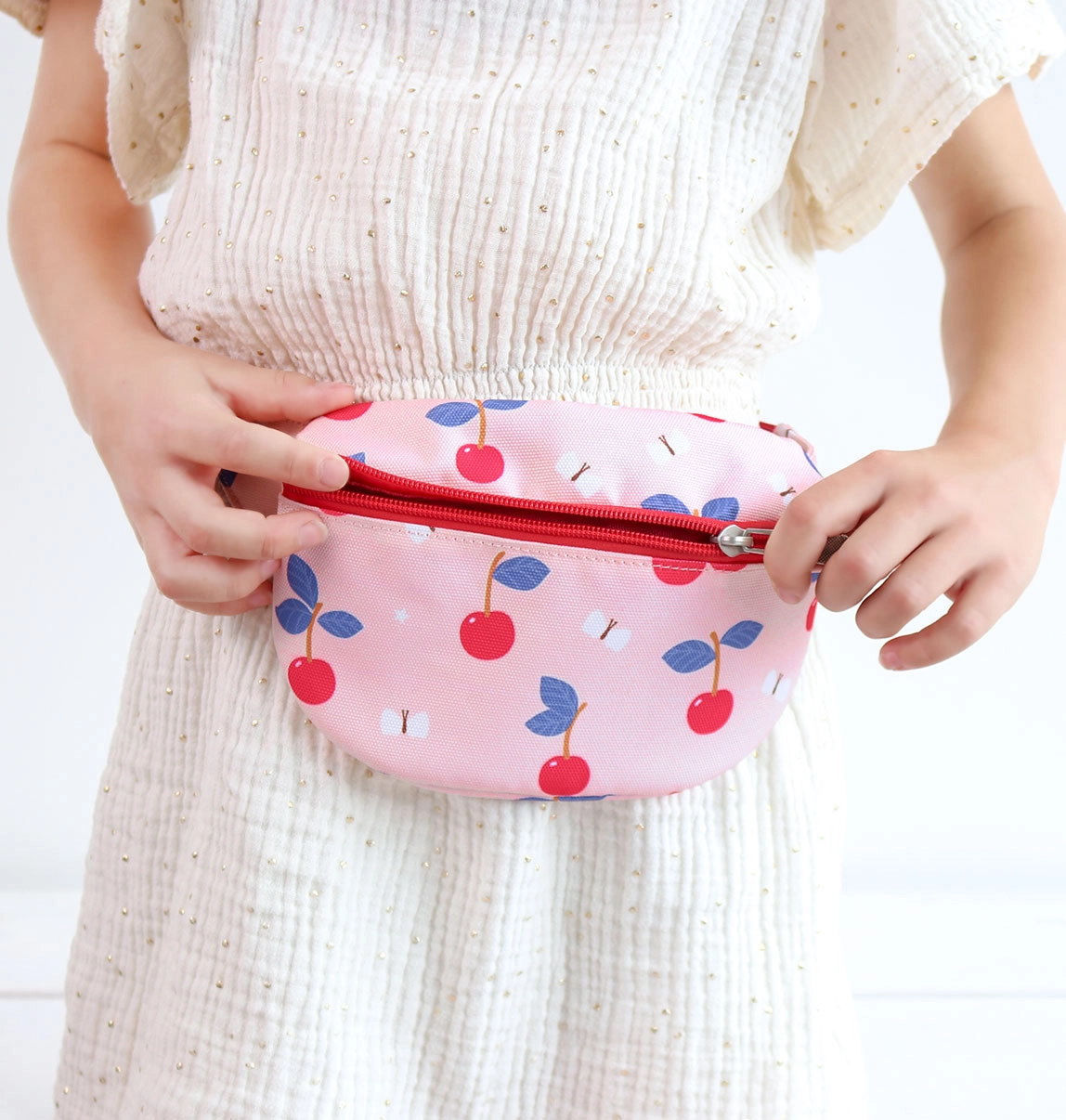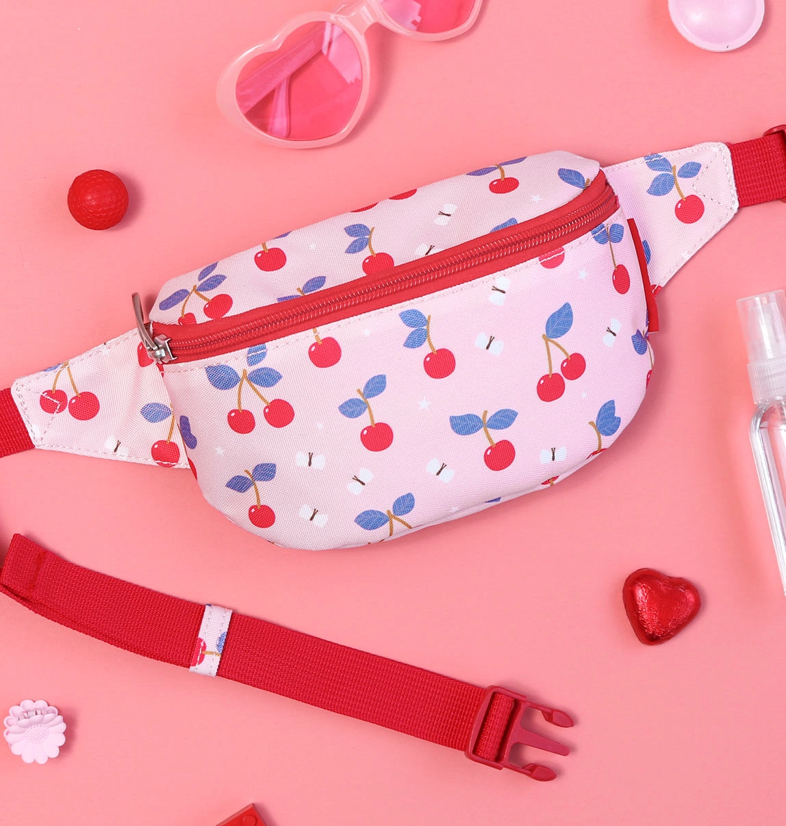 Mantén a tu peque con estilo con esta encantadora riñonera. La riñonera rosa para niños con alegre estampado de cerezas no es solo un accesorio de moda, sino también una ayuda práctica: