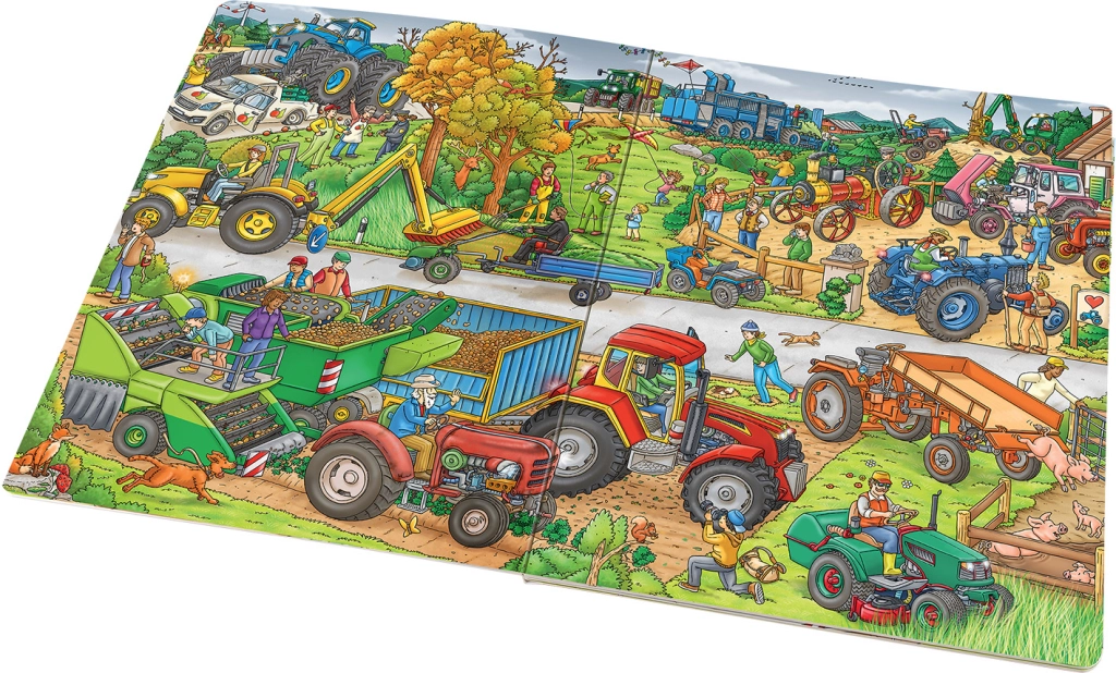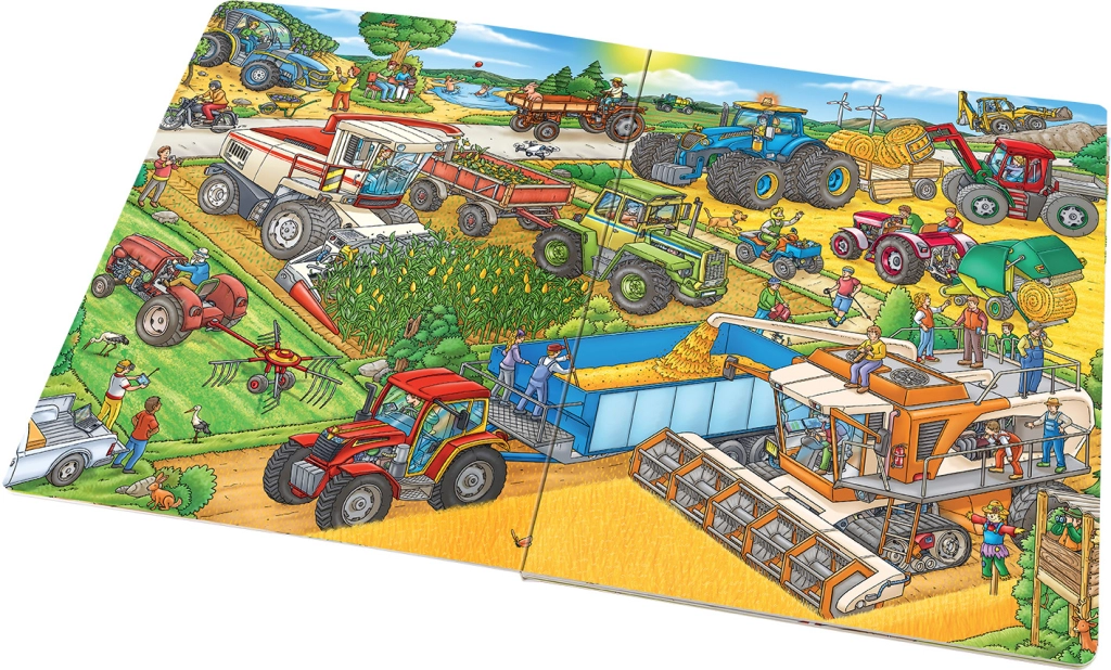 Gran libro de cartón con ricas ilustraciones de tractores y maquinaria agrícola que te guiarán por el mundo rural y su trabajo durante todo el año. Descubre aventuras e historias de héroes en las páginas de este libro fascinante.