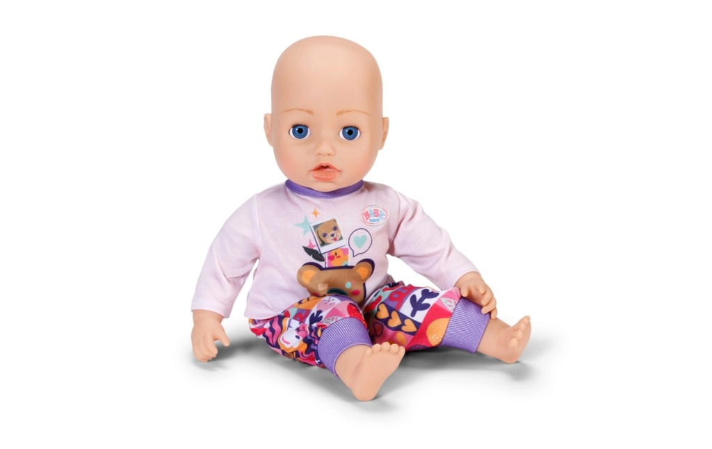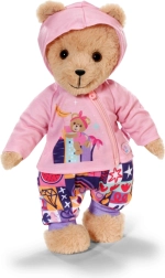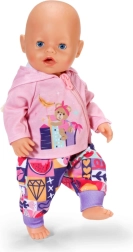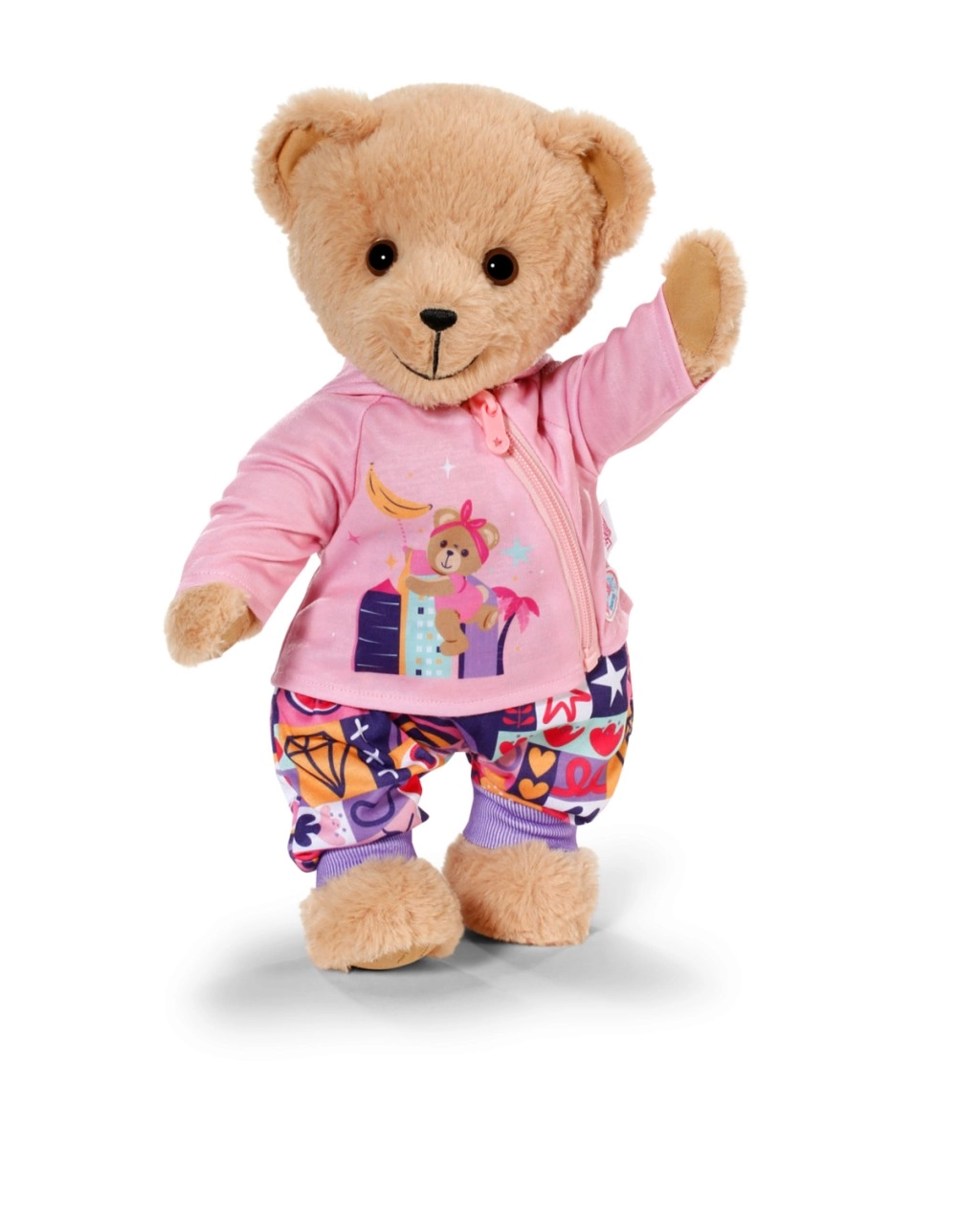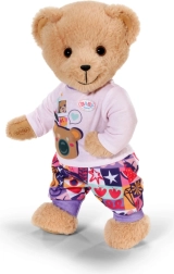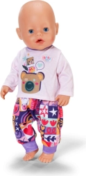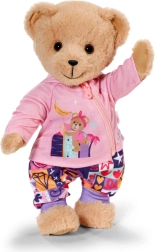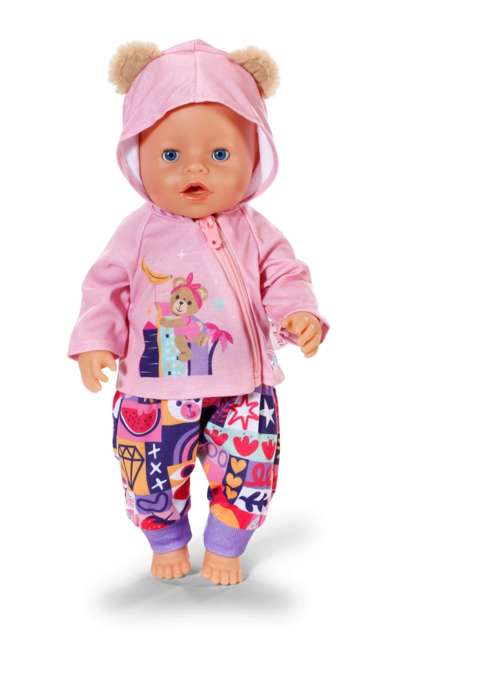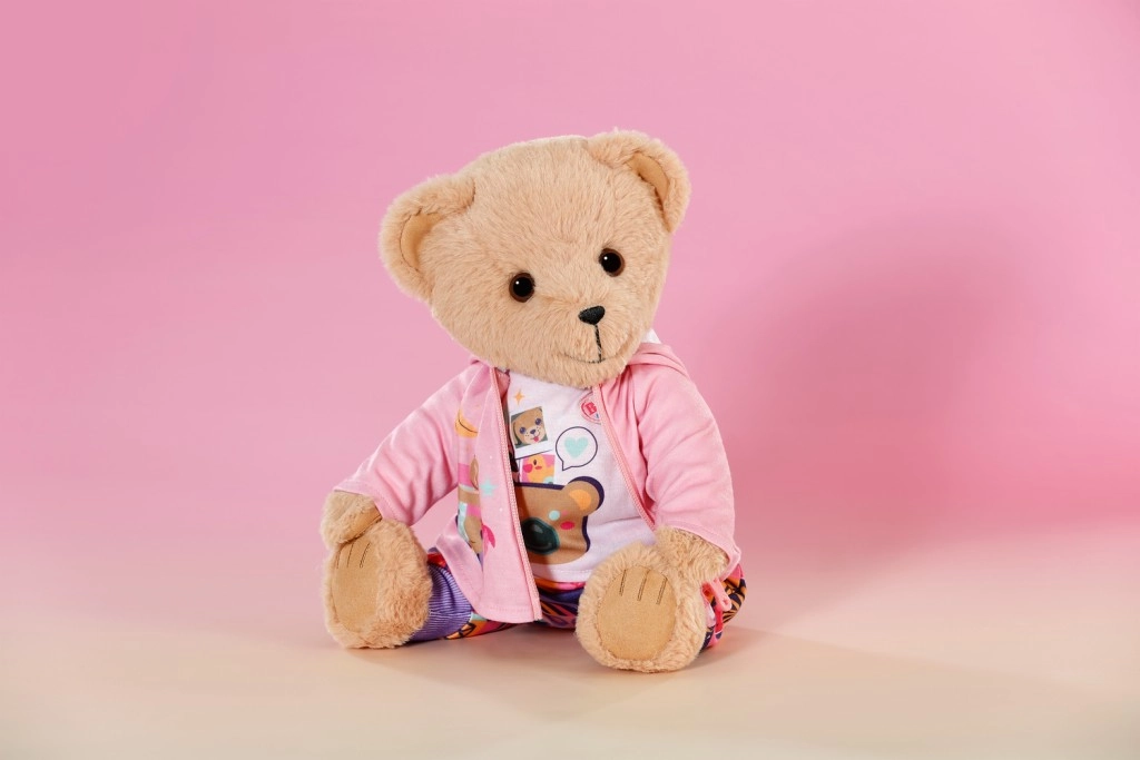 Con este set de ropa, tu muñeca y el osito BABY born Teddy tendrán comodidad y estilo para cada aventura. La sudadera rosa con cremallera, capucha y adorables orejitas se pone fácilmente, la camiseta lila claro de manga larga con osito es muy suave y los pantalones con estampado patchwork colorido aseguran comodidad durante el juego.