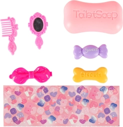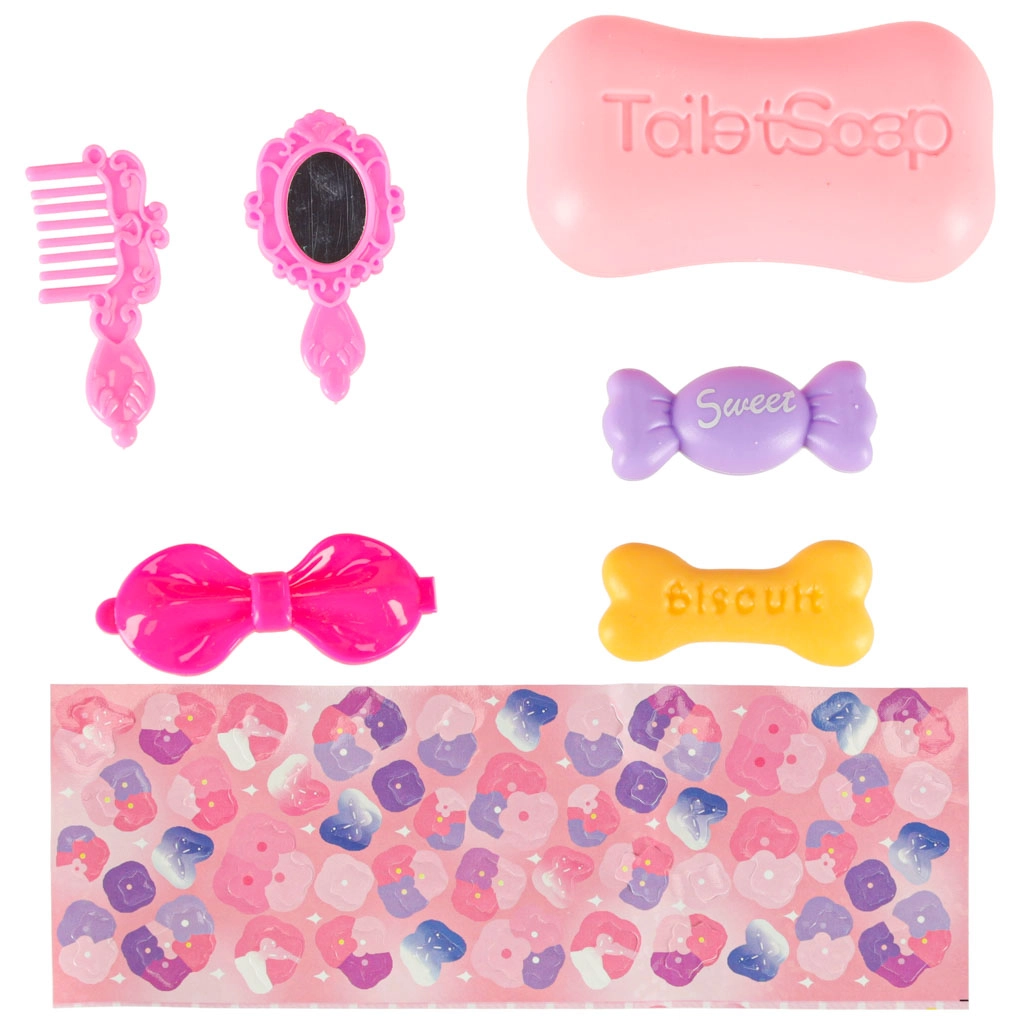 • Accesorios: jabón de juguete, peine, espejito, lazo-pinza, caramelo, galleta