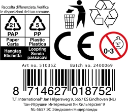 La superficie texturizada masajea agradablemente las palmas y los dedos, desarrollando la motricidad fina y fortaleciendo el agarre. Además, los colores llamativos estimulan el juego y un estado de ánimo positivo. Solo tienes que cogerla y dejar que el estrés se vaya.