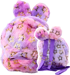 La mochila está hecha de peluche suave con estrellitas de color dorado integradas en el material. Las orejitas en la parte superior añaden un encanto de cuento, y toda la combinación de colores pastel resulta amigable para los pequeños. Cuenta con un compartimento principal con cremallera y un bolsillo delantero más pequeño, ideal para objetos pequeños.