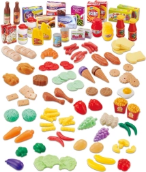 El set incluye: 120 elementos variados, incluyendo frutas, verduras, panadería, snacks, bebidas y envases.