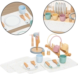 Con este juego de vajilla de madera, los niños pueden jugar a la casita, al restaurante o a organizar tés con amigos. Cada pieza está cuidadosamente fabricada con madera de alta calidad, segura y duradera, que resiste incluso un uso intensivo. Incluye platos, cuencos, tazas, cucharitas, tenedores, servilletas, condimentos y un soporte para la vajilla.