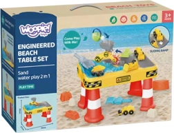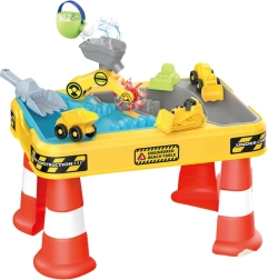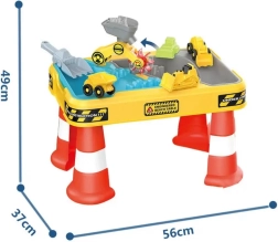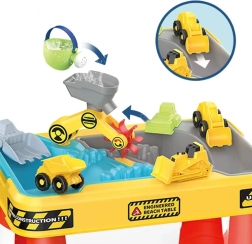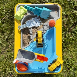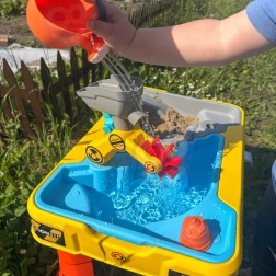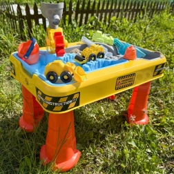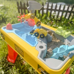 El gran set de mesa con temática de obra ofrece a los niños horas de juego sensorial y creativo. La cámara doble permite llenar por separado una parte con agua y otra con arena, de modo que los pequeños constructores pueden probar a excavar, verter, echar agua y conducir vehículos. Gracias a las patas “en forma de cono” la mesa es firme y segura para uso en exterior e interior.