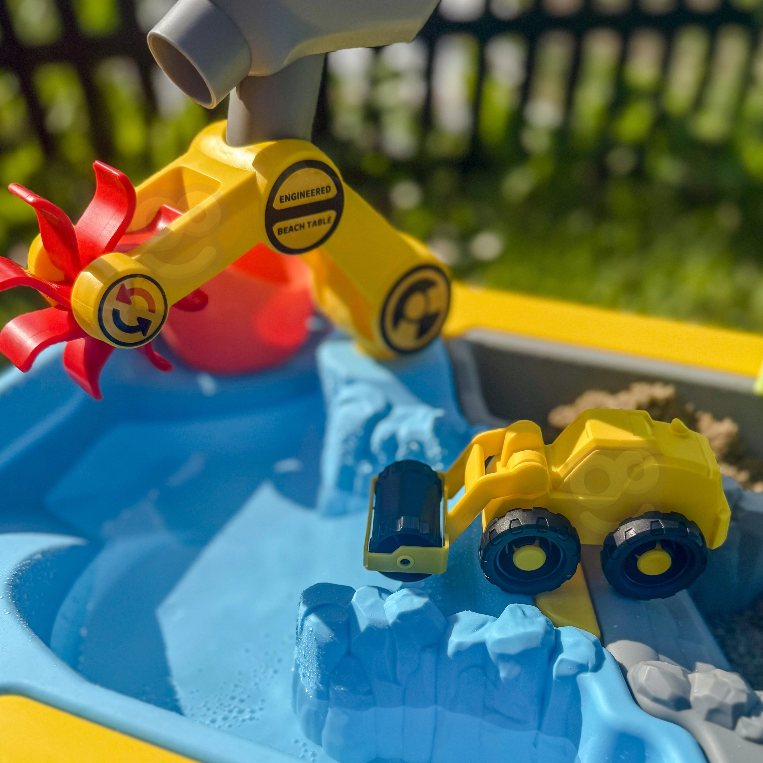 - Juego sensorial: el flujo de agua, el trasvase de arena y la conducción de los cochecitos desarrollan la motricidad fina y la coordinación mano–ojo.