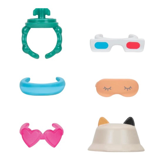 En la caja encontrarás distintos tipos de accesorios —gafas, diademas, un pequeño sombrero o un antifaz para dormir— que se intercambian fácilmente. Esto fomenta la creatividad, la motricidad fina y el juego de roles. El set es perfecto para compartir con amigos, intercambiar figuras y crear combinaciones de moda propias.