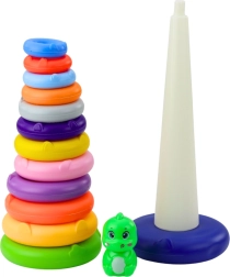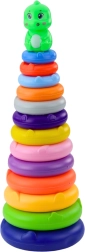 Este juguete consta de una base firme y estable, un poste alto y 13 anillos de colores de distintos tamaños. Todos los elementos están hechos de plástico ligero y resistente, seguro para los niños pequeños. La parte superior de la torre está adornada con una figura de un simpático dinosaurio, que capta la atención de los niños y los anima a seguir jugando.