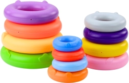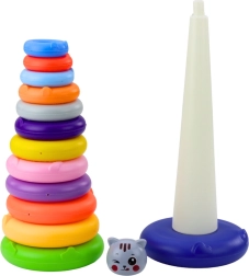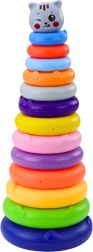 Este juguete consta de una base ancha y estable, un poste alto y 13 aros de colores que el niño ensarta por sí mismo, creando así una torre impresionante. En la parte superior hay una figura de un dulce gato que además anima al niño a jugar y añade un atractivo elemento visual.