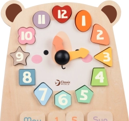 El reloj de madera con forma de osito de la marca Classic World es un juguete versátil que ayuda a los niños a aprender la hora, los días de la semana, los meses y a reconocer colores y formas. Gracias a los bloques extraíbles con números y nombres, los más pequeños pueden practicar la coordinación mano-ojo, el pensamiento lógico y las habilidades manuales.