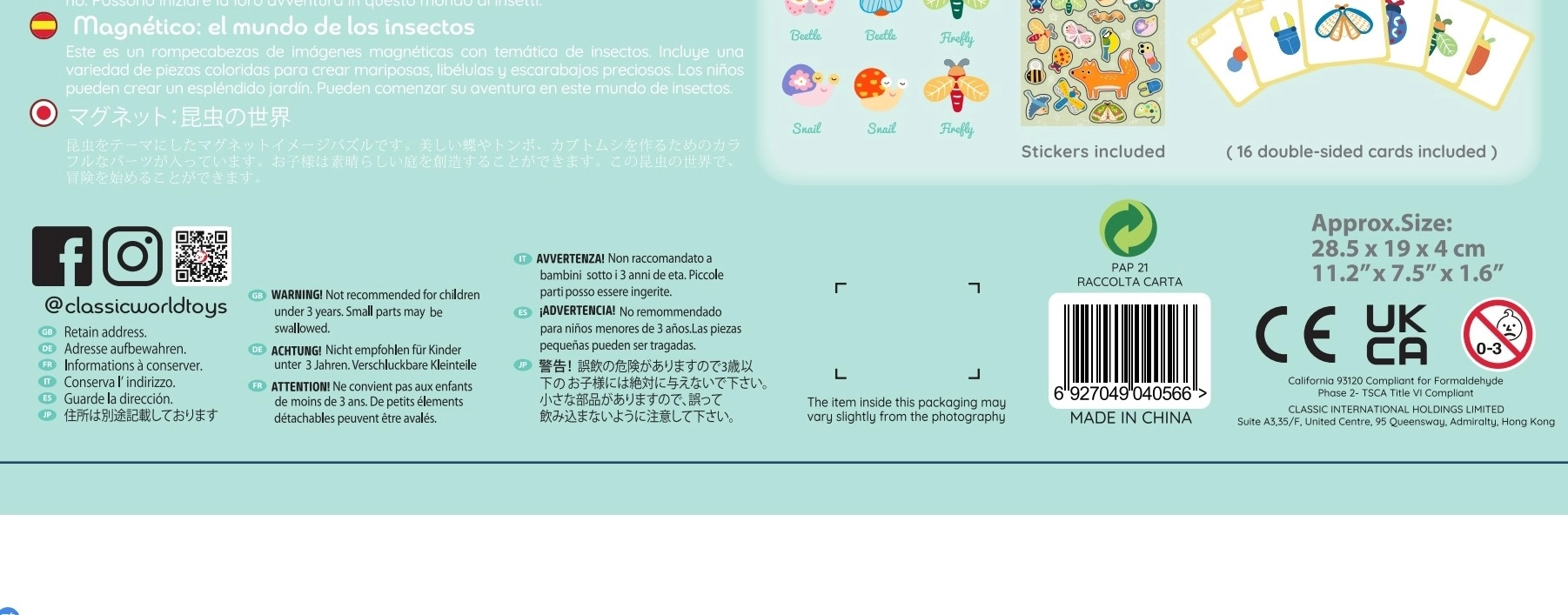 El rompecabezas magnético de animales de CLASSIC WORLD es un set de puzles divertido y educativo que ayuda a los niños a descubrir la diversidad de los animales del prado y a desarrollar sus habilidades creativas. El set favorece el desarrollo de la imaginación, la motricidad y las capacidades de observación de tu hijo.