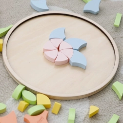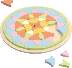 Este rompecabezas de madera permite a los niños crear una cantidad ilimitada de patrones, ya sea siguiendo modelos o su propia imaginación. Es ideal tanto para el juego independiente como para crear en conjunto con amigos o adultos.