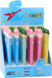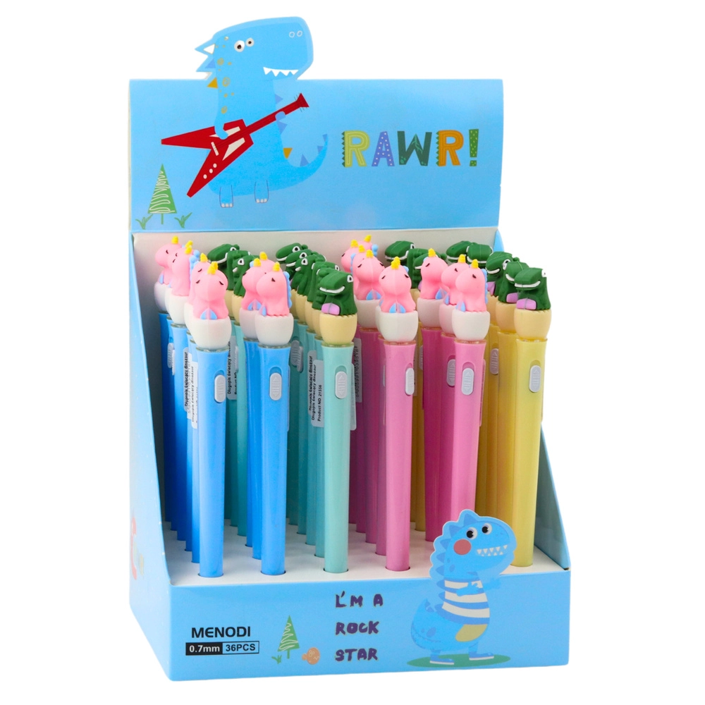 La parte superior del bolígrafo está adornada con una figurita de dinosaurio de goma que sirve como elemento decorativo y le aporta un toque encantador. Gracias a la tapa, la punta de escritura queda bien protegida contra el secado y el botón integrado activa la llamativa luz LED, que se enciende con cada pulsación.
