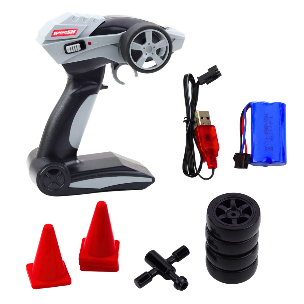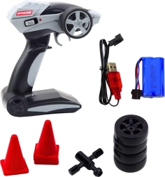 El set también incluye un juego de neumáticos de repuesto, una llave para su sustitución y conos para practicar derrapes. Este modelo desarrolla habilidades motoras, reflejos y la pasión por la tecnología y la conducción deportiva.
