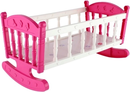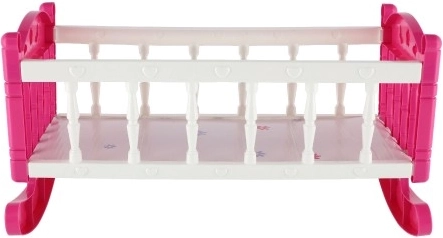 La cuna en rosa y blanco con delicados detalles está hecha de plástico resistente, permitiendo mecer y dormir a la muñeca. Ideal para fomentar la imaginación durante el juego.
