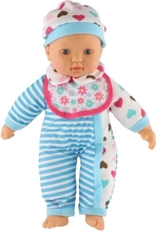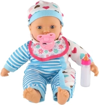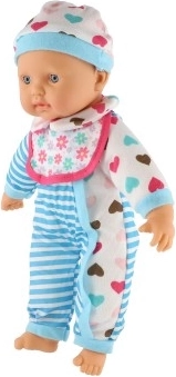 La muñeca viste un conjunto azul y blanco a rayas con adorables corazoncitos. Incluye chupete y biberón, lo que aporta un toque realista al juego.