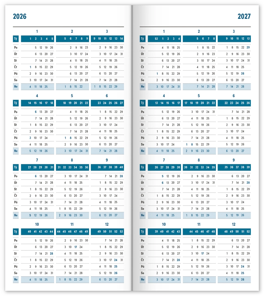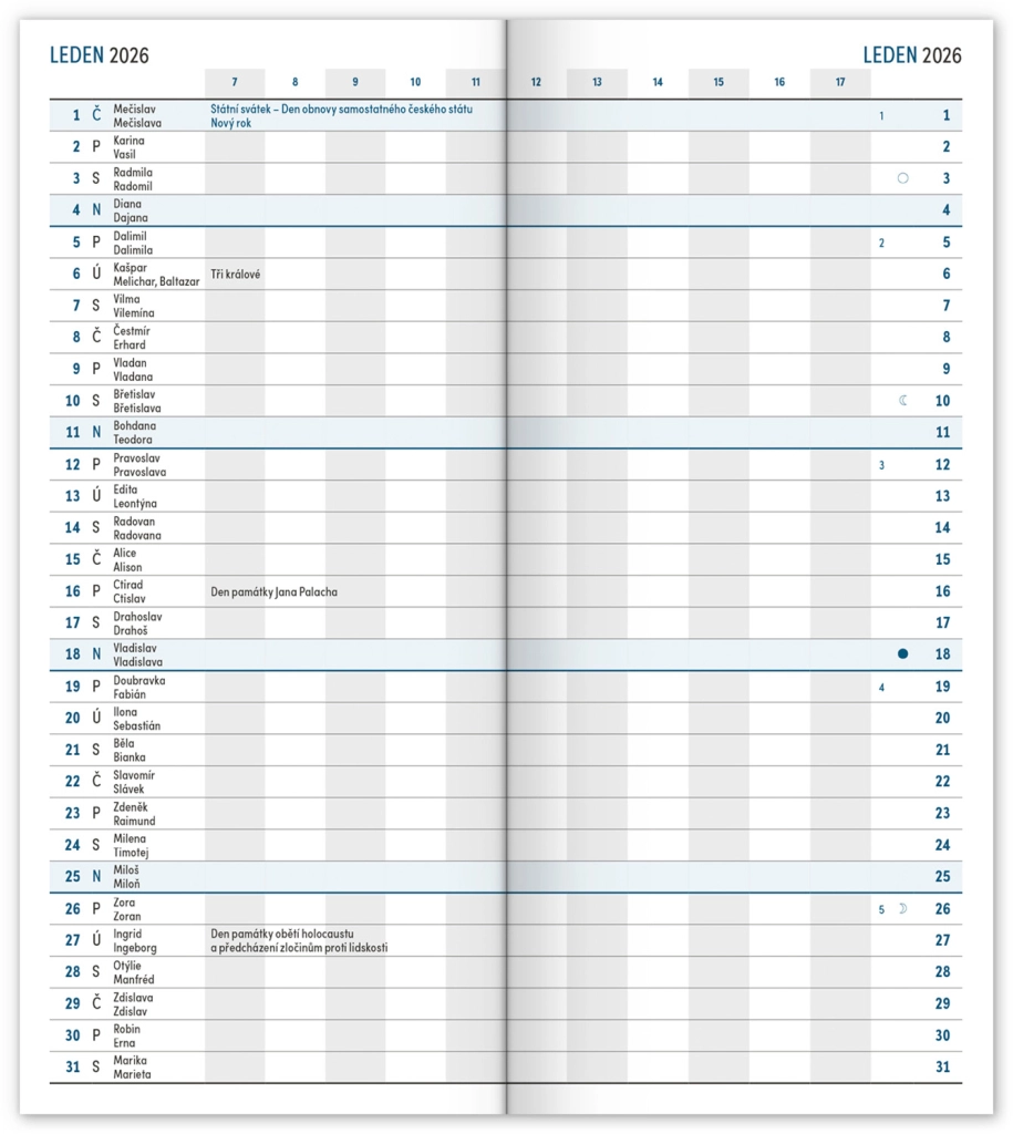 La agenda es ideal para organizar tu tiempo gracias a su vista mensual. Está equipada con un calendario checo que contiene datos importantes como nombres, festivos y días conmemorativos, perfecto para el uso diario.