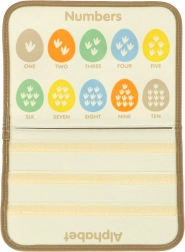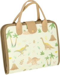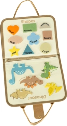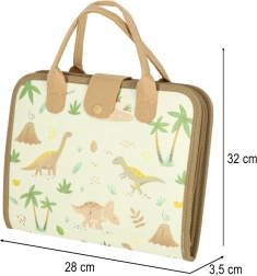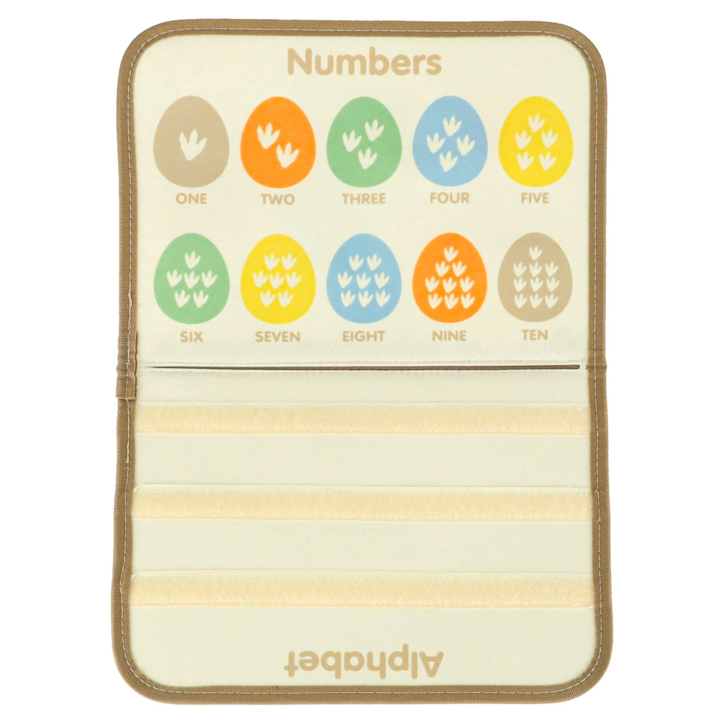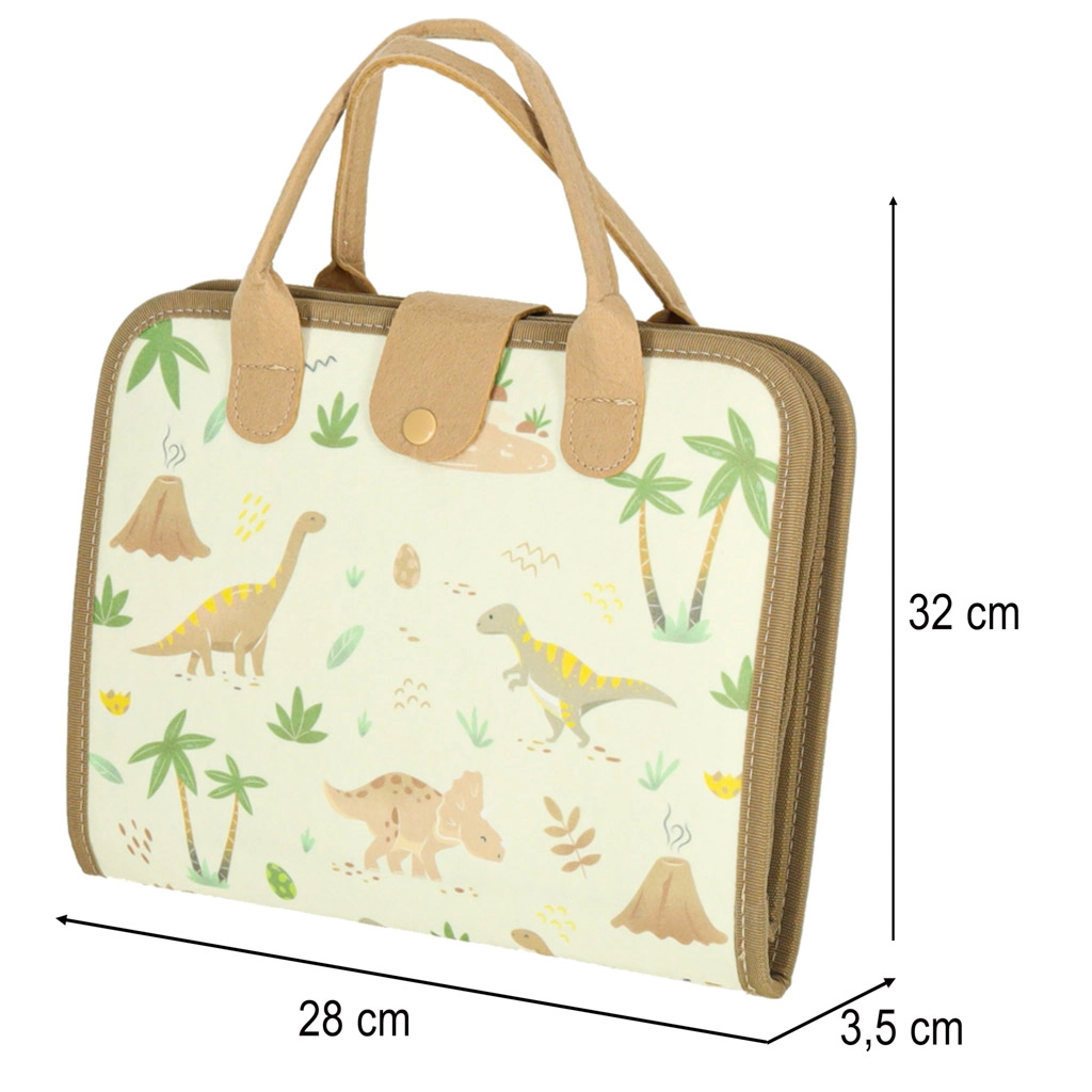 El maletín incluye una pizarra borrable y componentes educativos que permiten a los niños desarrollar conocimientos a través del juego. También hay figuras de fieltro de dinosaurios para un juego creativo.