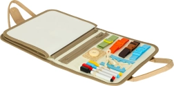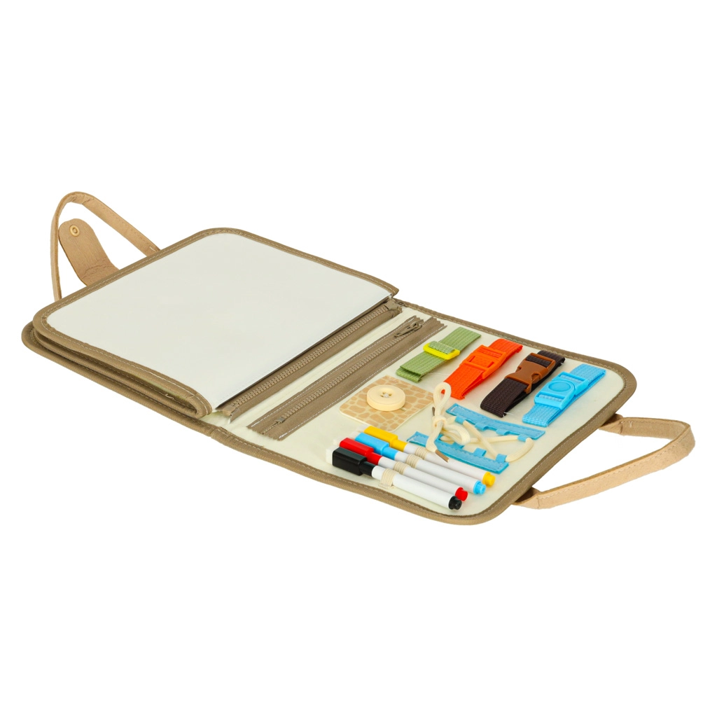 Este maletín está equipado con una variedad de elementos para el aprendizaje práctico. Permite a los niños practicar abrochar botones, cerrar cremalleras y otras actividades divertidas que fomentan las habilidades motoras.