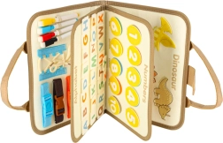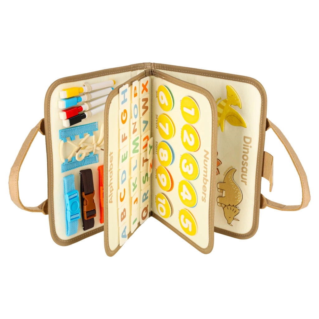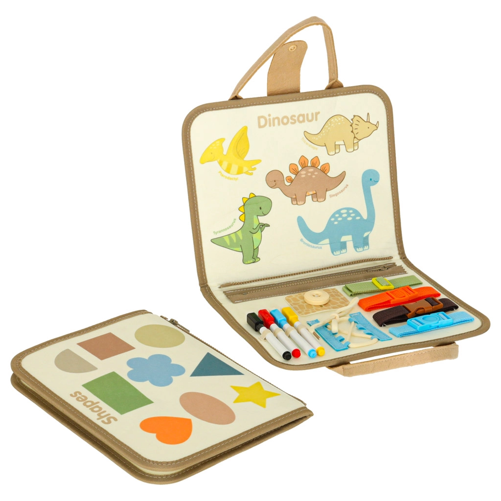 El maletín sensorial Montessori con dinosaurios combina la alegría del descubrimiento con el aprendizaje. Con hebillas, cremalleras, botones y otros elementos, los niños pueden practicar sus habilidades de forma divertida. Este maletín compacto y visualmente atractivo es ideal para usar en casa o de viaje.
