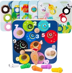 Este juego educativo de madera 2 en 1 aporta a los niños la alegría de descubrir. Las “hojas” verdes giratorias esconden gusanitos magnéticos y añaden al juego un elemento de sorpresa y desafío. El pajarito de madera con pico magnético ayuda a los niños a apuntar con precisión, atrapar y trasladar los gusanitos a los orificios, lo que fortalece la motricidad fina y la paciencia.