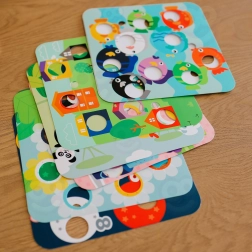 Las placas de colores con números, colores, formas y animalitos amplían los escenarios de juego. Favorecen la alfabetización matemática temprana y el reconocimiento de colores y formas.