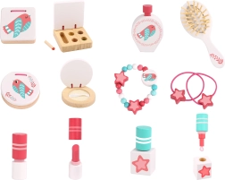 - El set incluye accesorios de madera: esmalte de uñas, pintalabios, pulsera, pendientes, cepillo para el cabello, perfume, polvera y sombras de ojos.