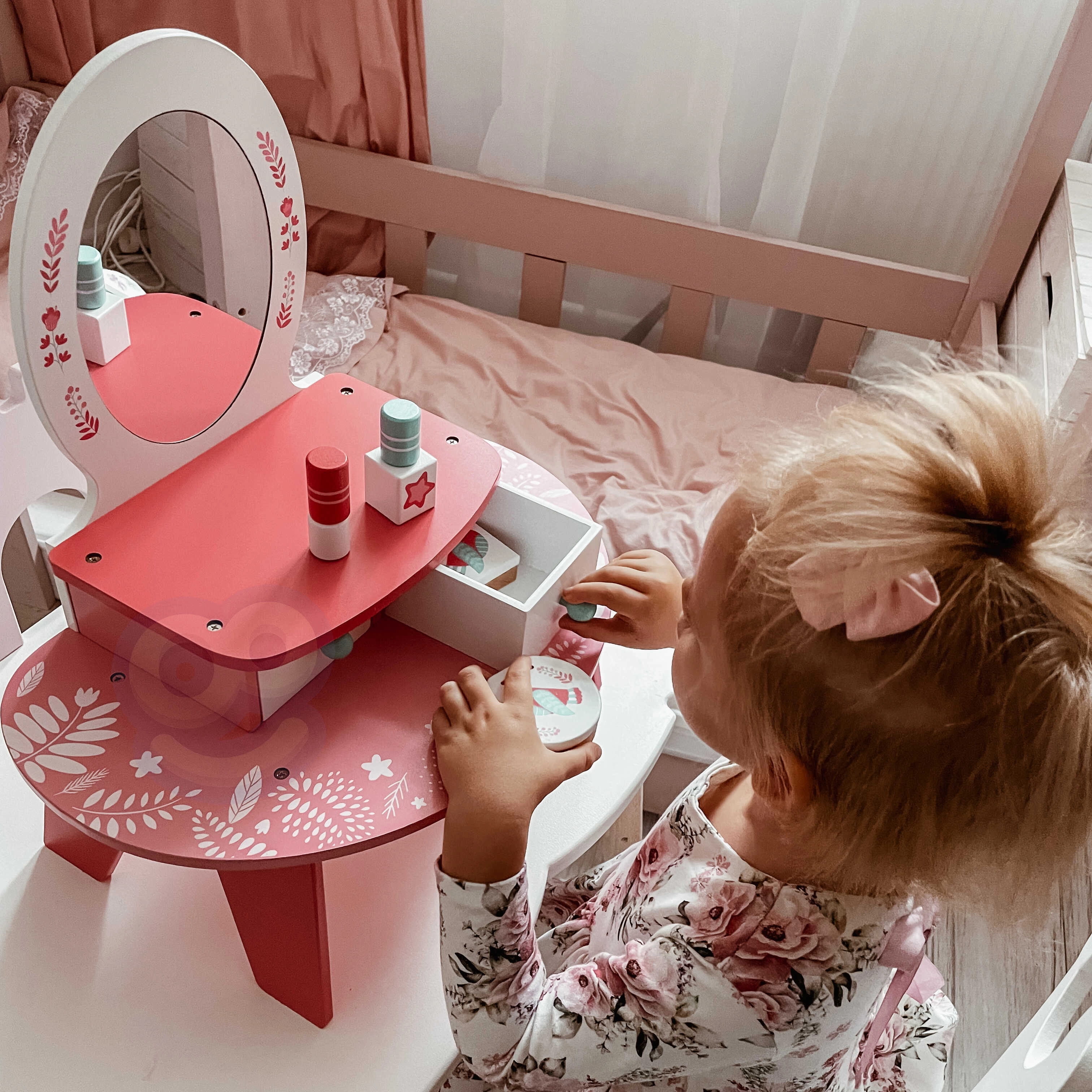 - El tocador rosa permite a las niñas crear maquillaje junto con mamá.